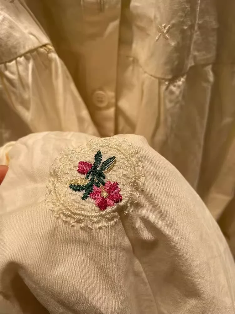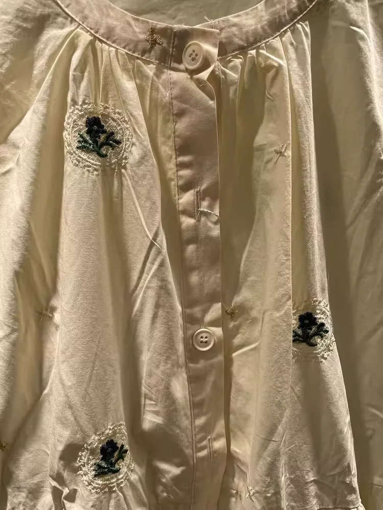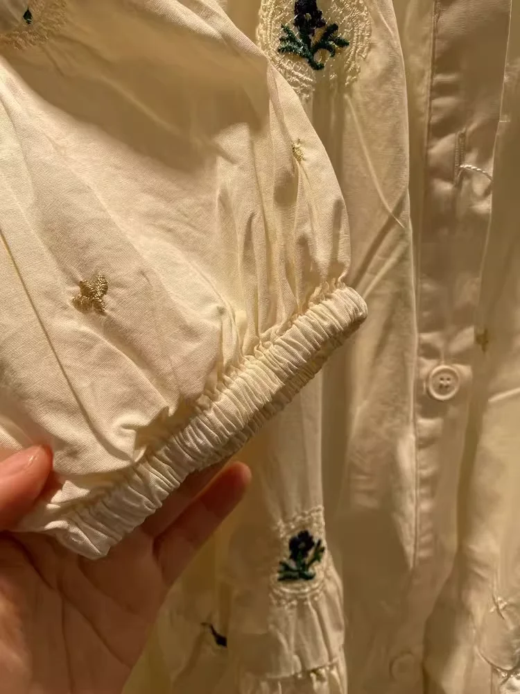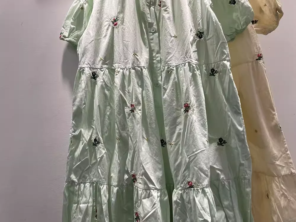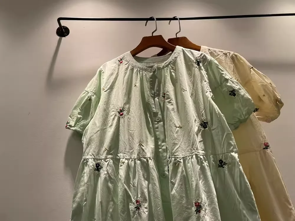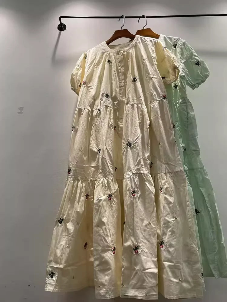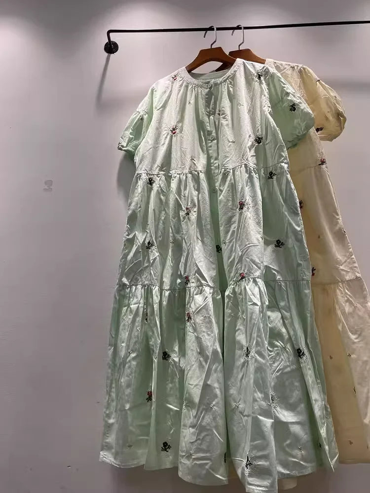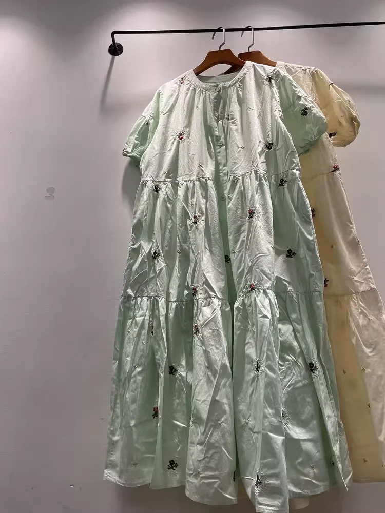 100% cotton women dress Japan style short sleeve beige green embroider maxi dress for women long dress mori girl