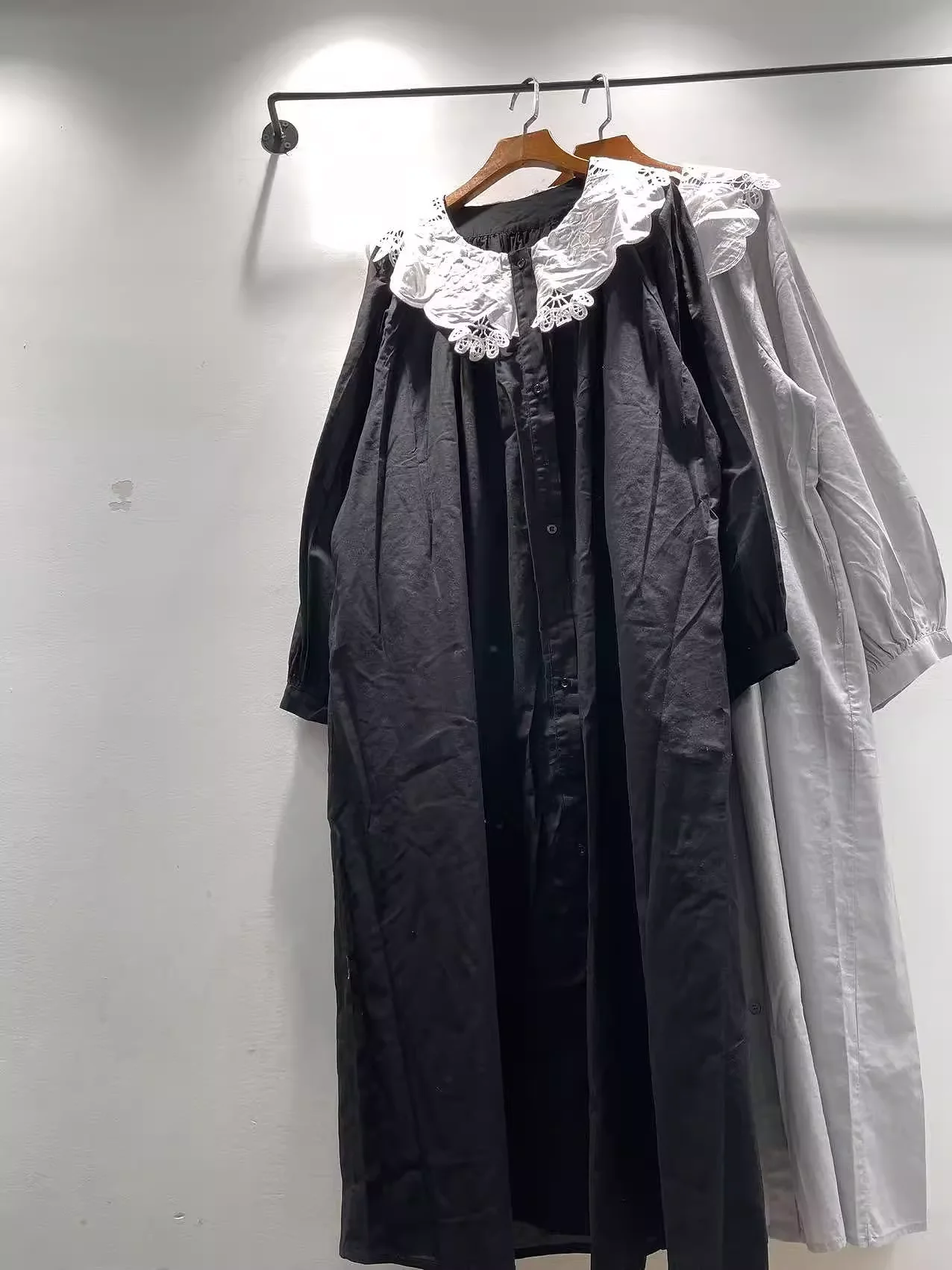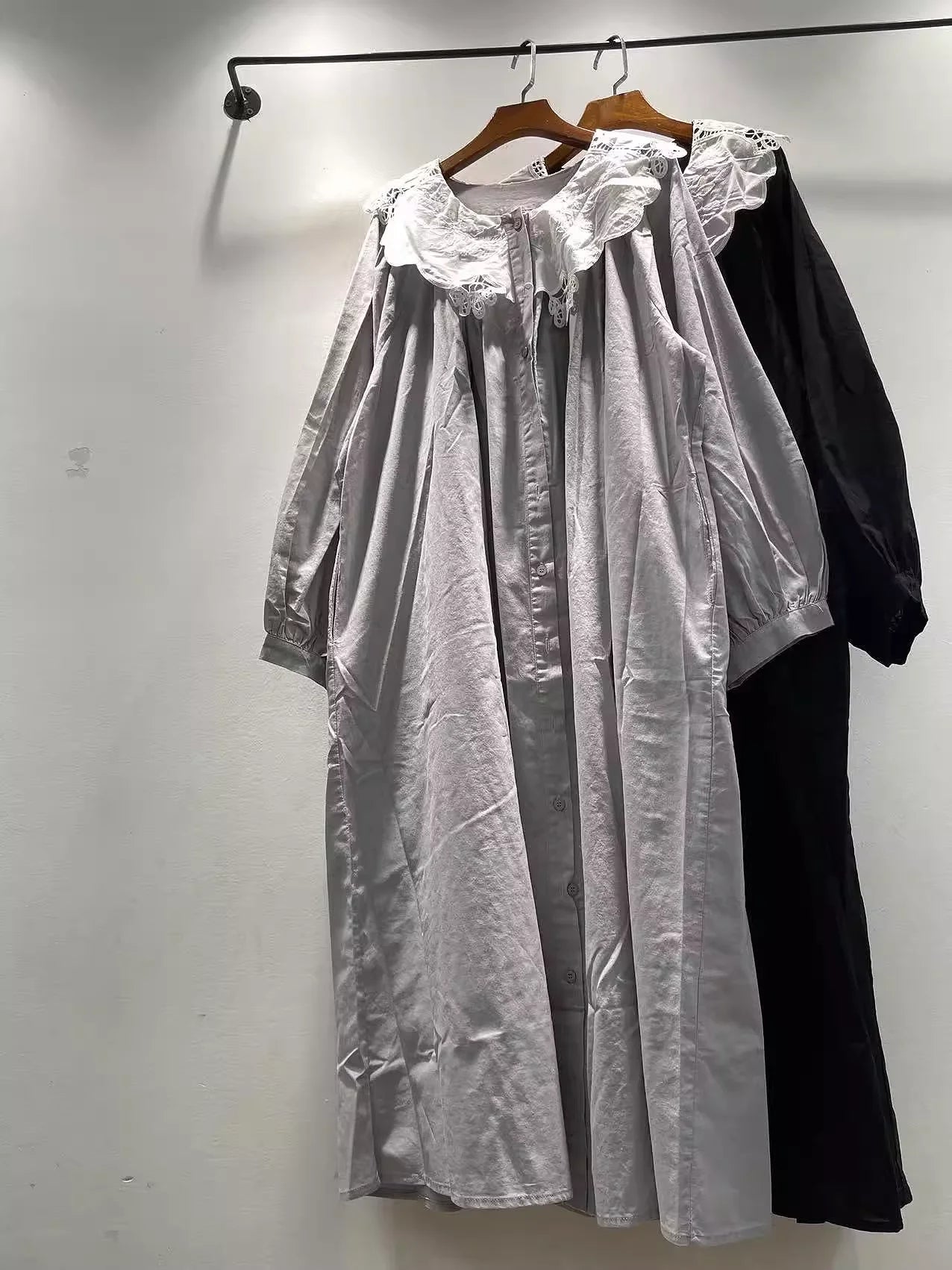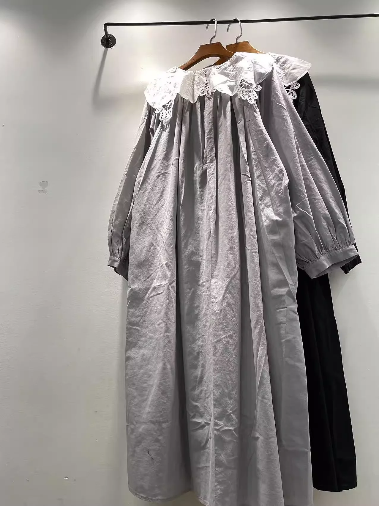 Bust 138cm Mori kei clothing Japanese style pure cotton lace collar black dress for women autumn vintage long dress
