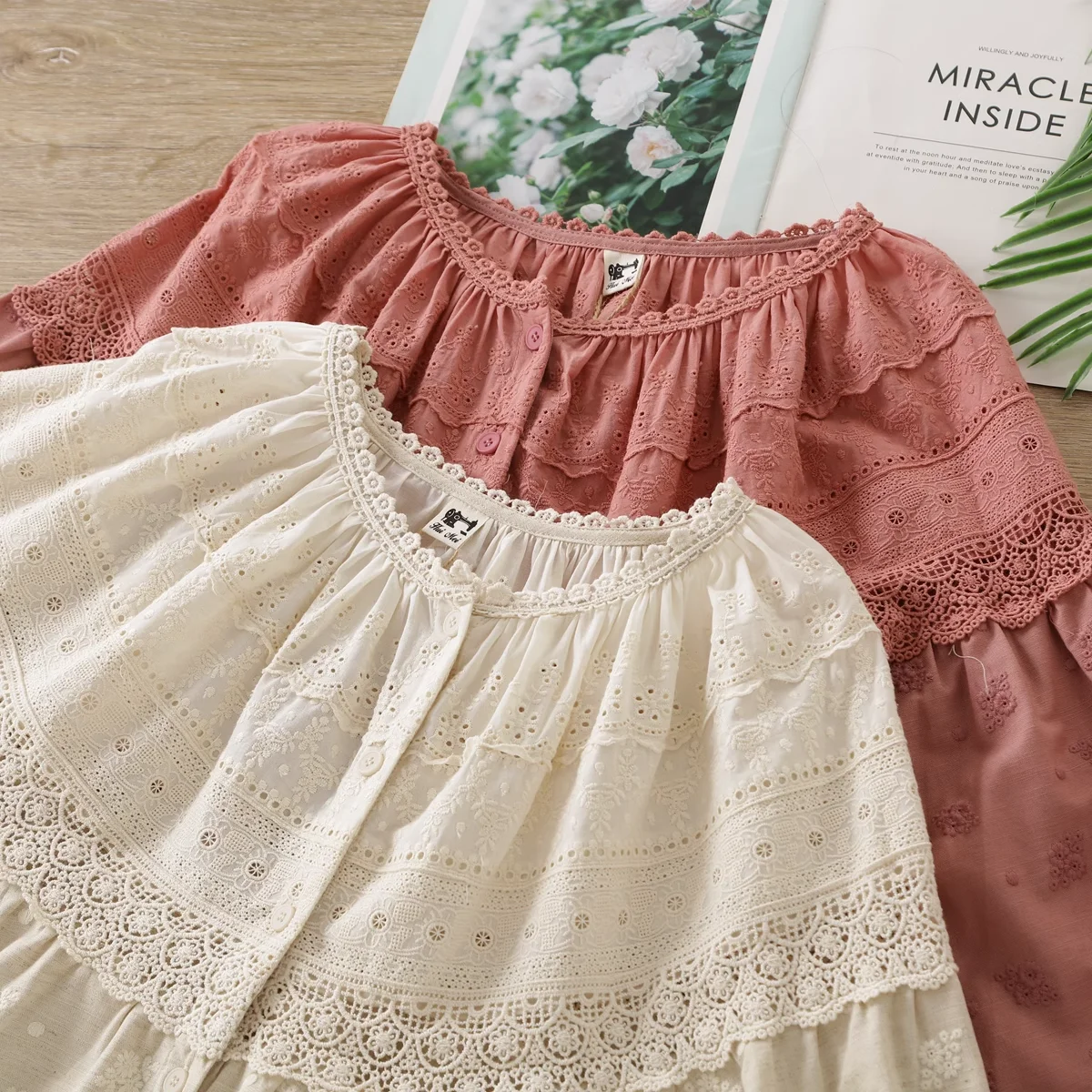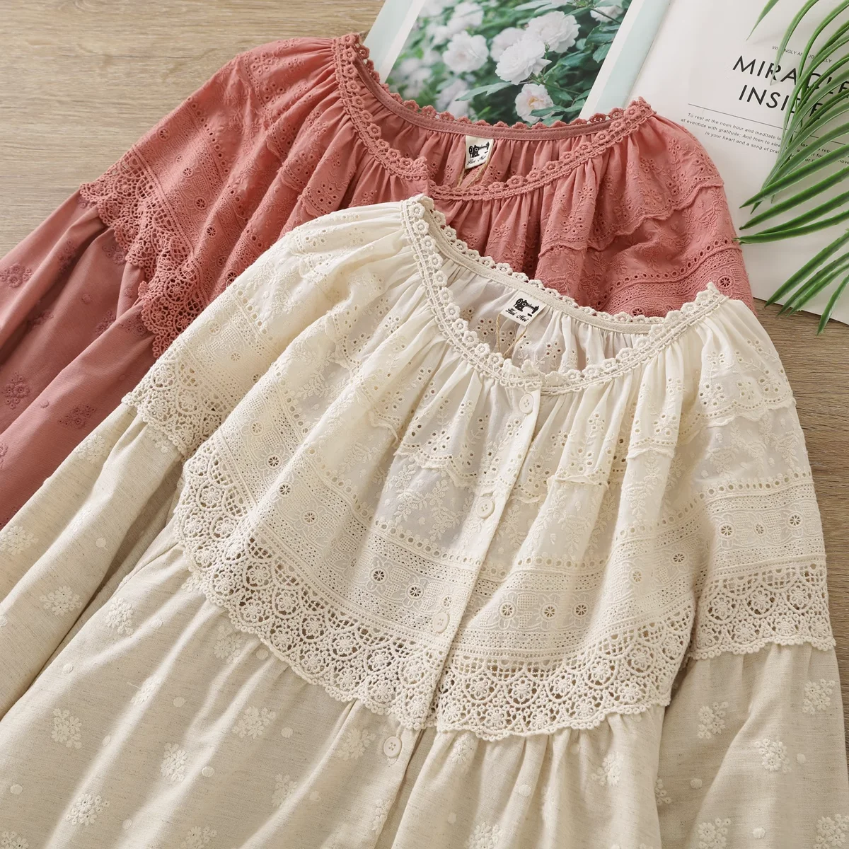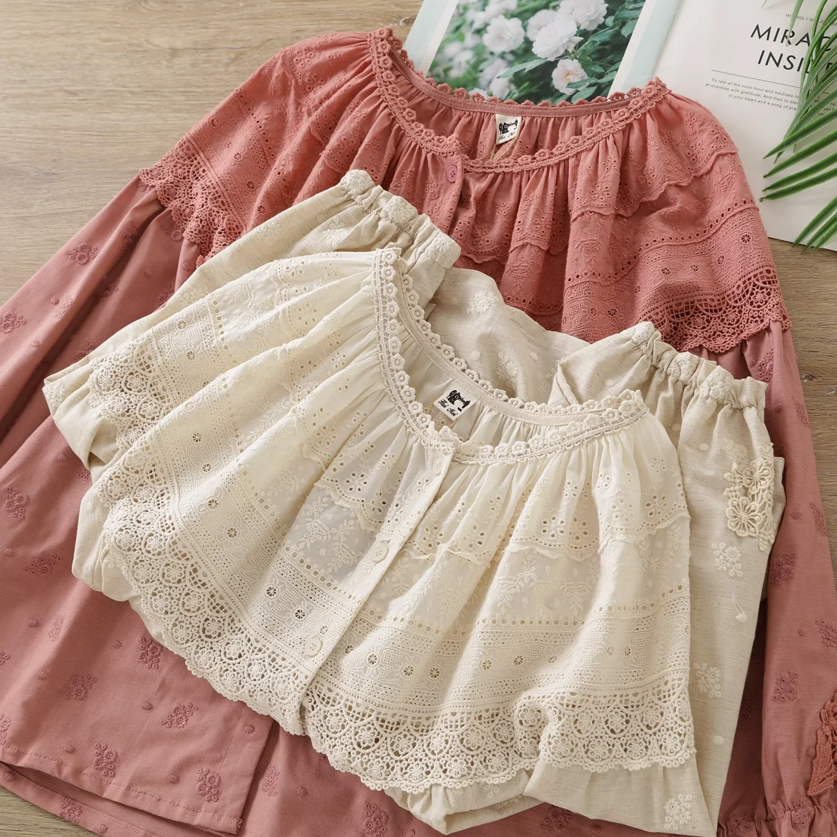 Cute clothes mori girl style Japan designer cotton lace crochet patchwork print shirts and blouses for women summer tops