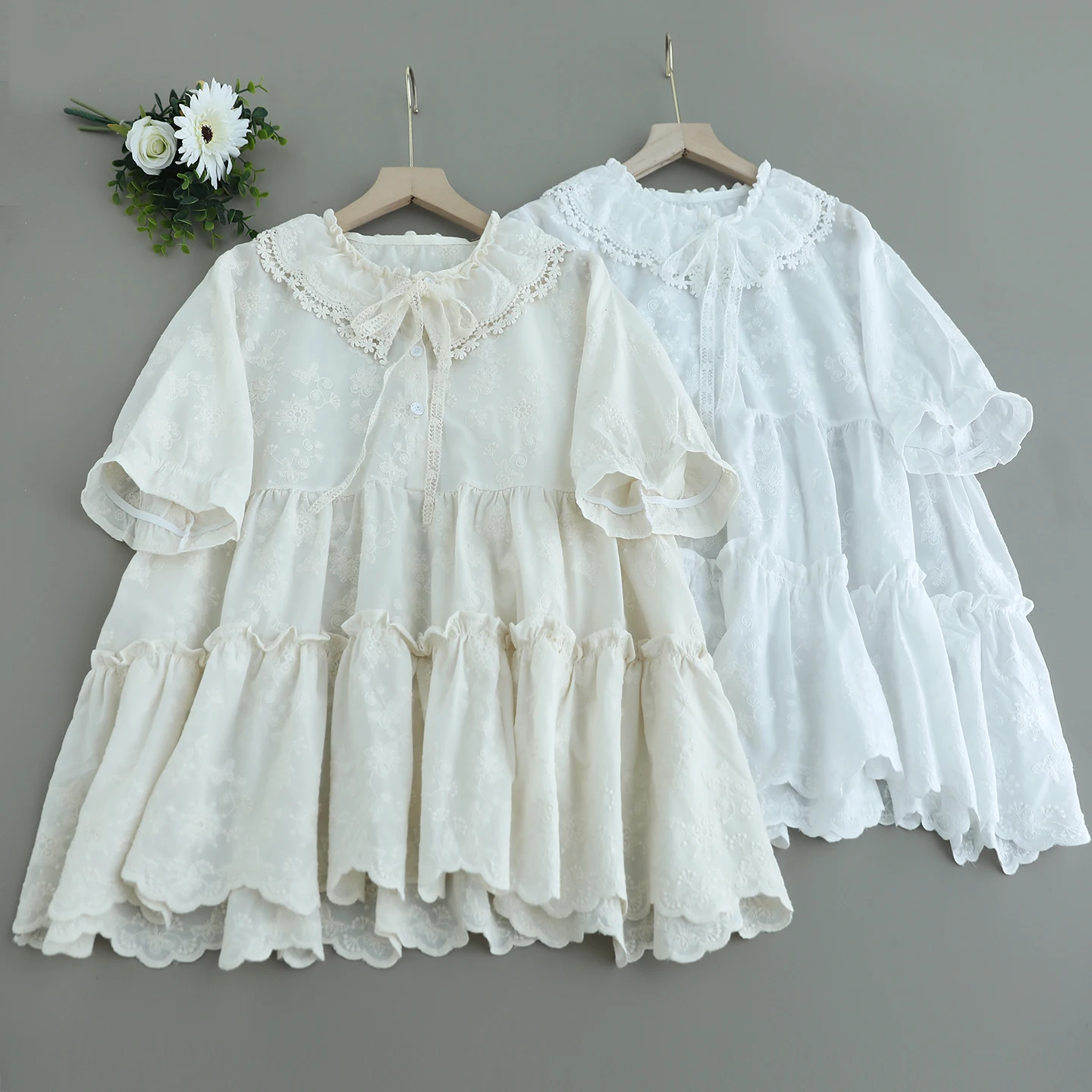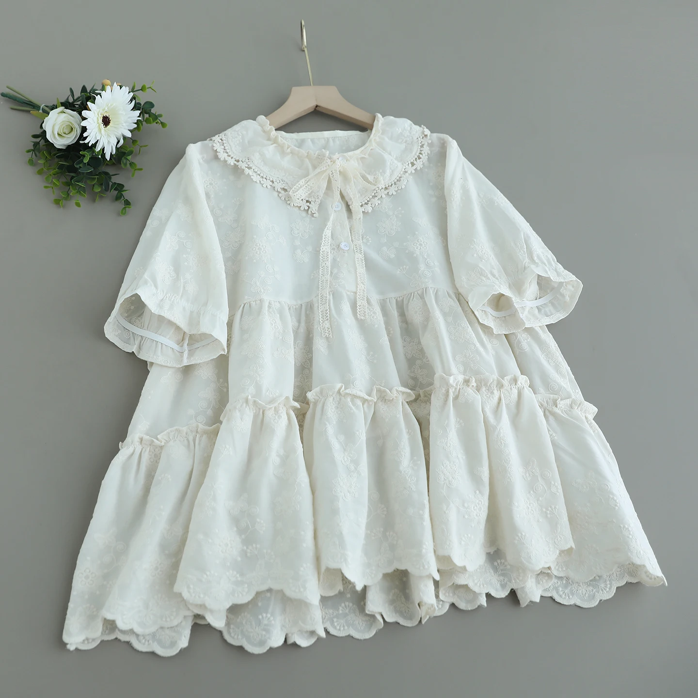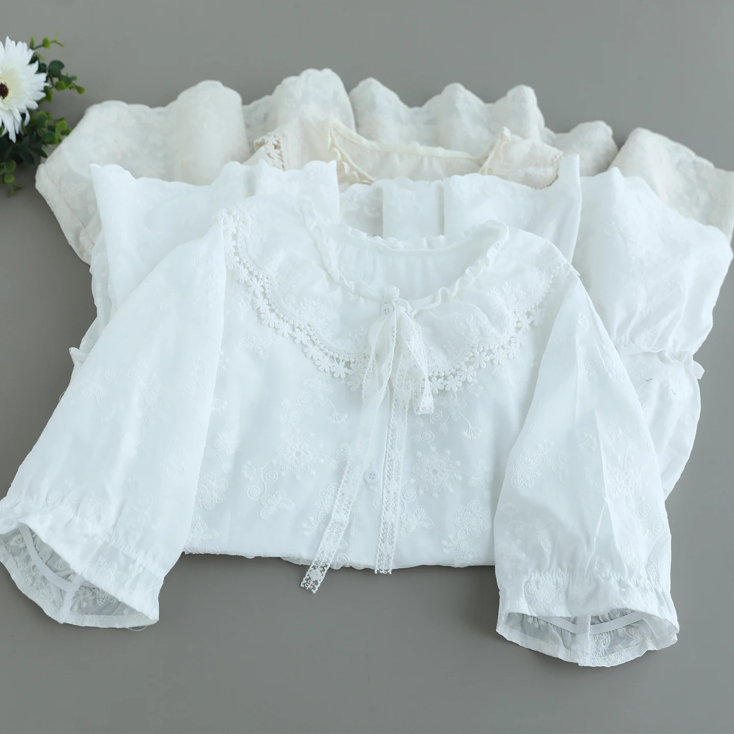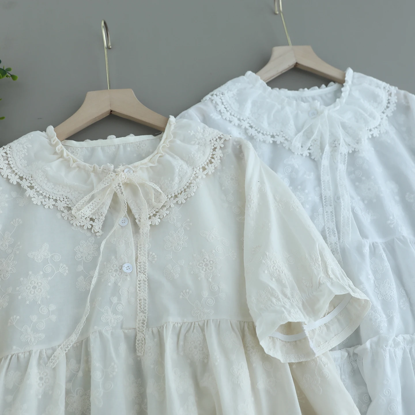 Japanese Sweet Mori Girl Embroidery Jacquard Cotton Shirts Women Summer Ruffled Lace Up Collar Short Sleeve Casual Blouse Tops