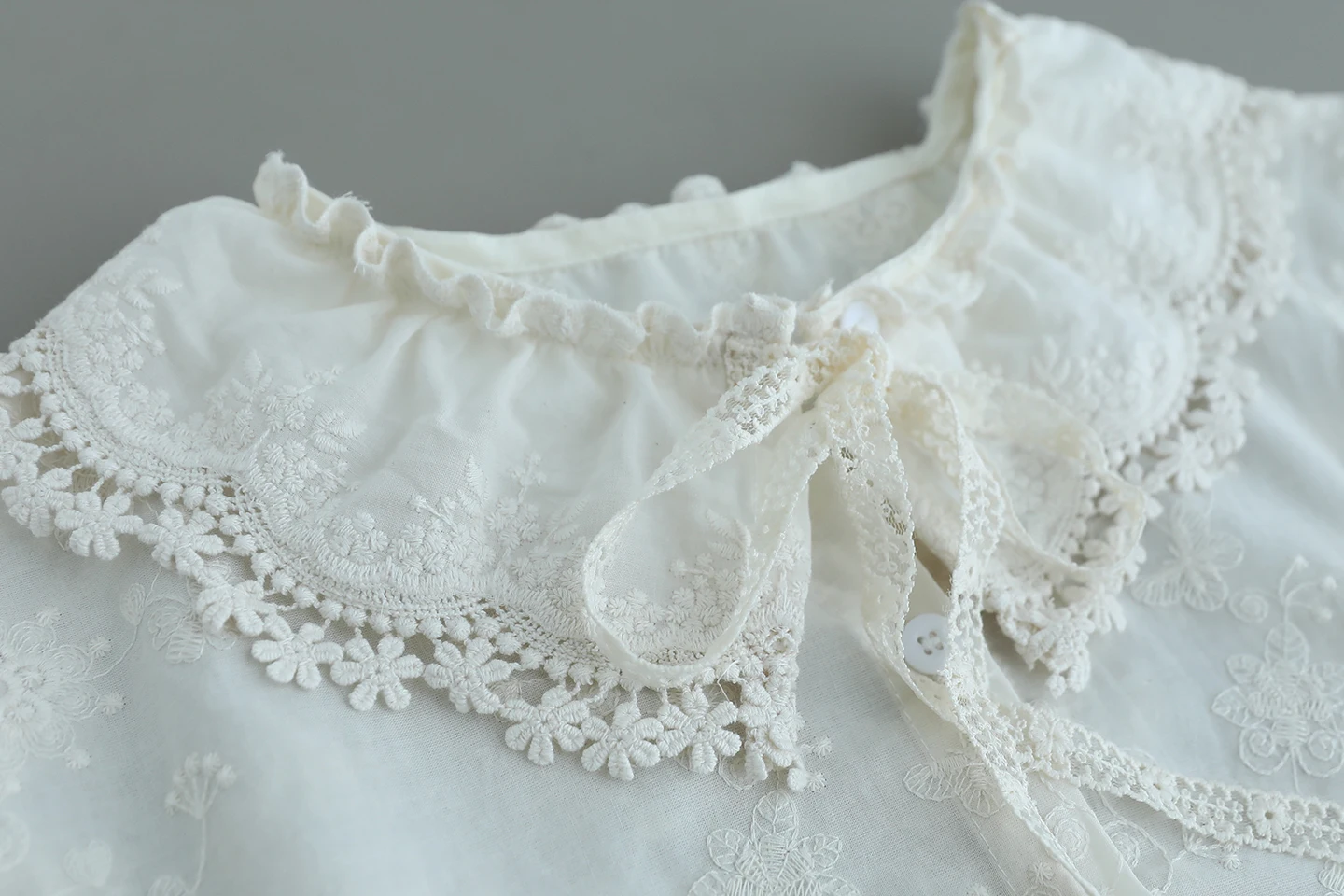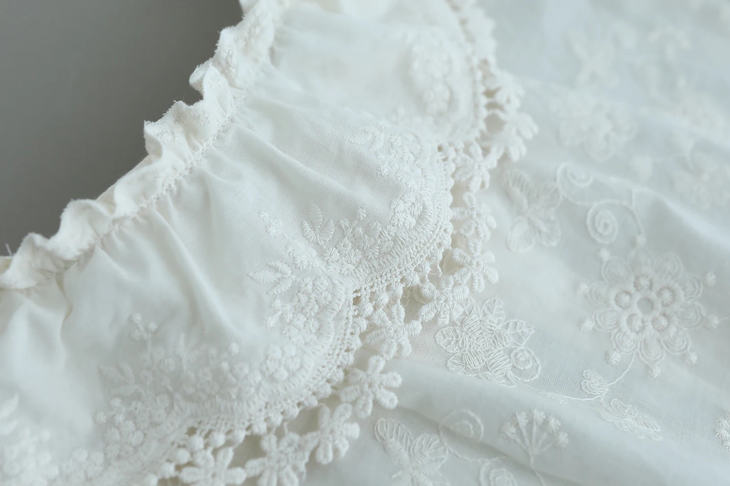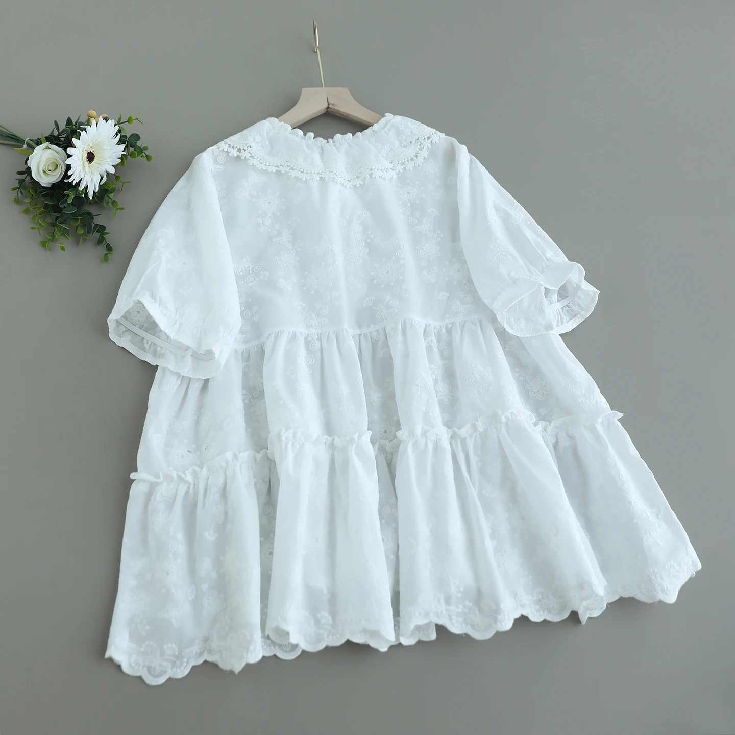 Japanese Sweet Mori Girl Embroidery Jacquard Cotton Shirts Women Summer Ruffled Lace Up Collar Short Sleeve Casual Blouse Tops