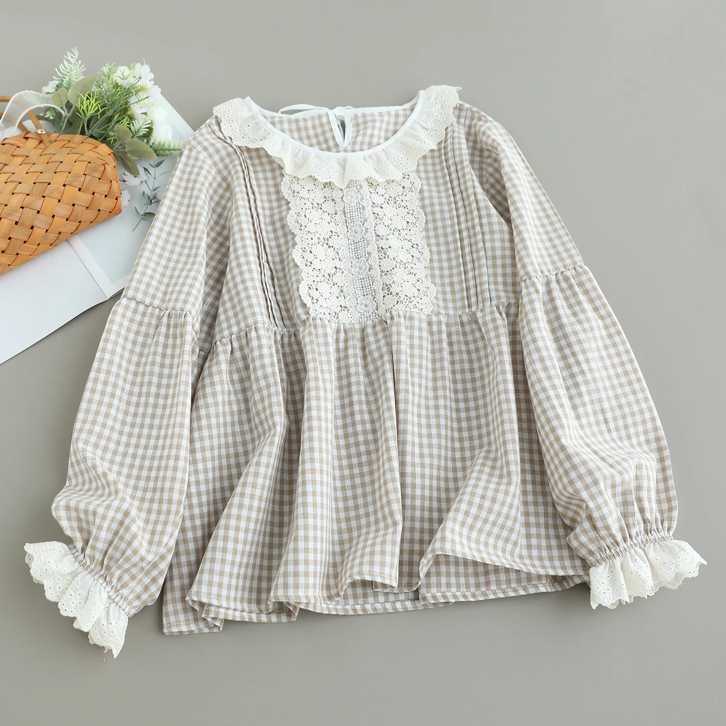 Japanese Sweet Mori Girl Vintage Plaid Lace Patchwork Cotton Shirts Women Autumn O-Neck Long Sleeve Casual Loose Blouse Tops