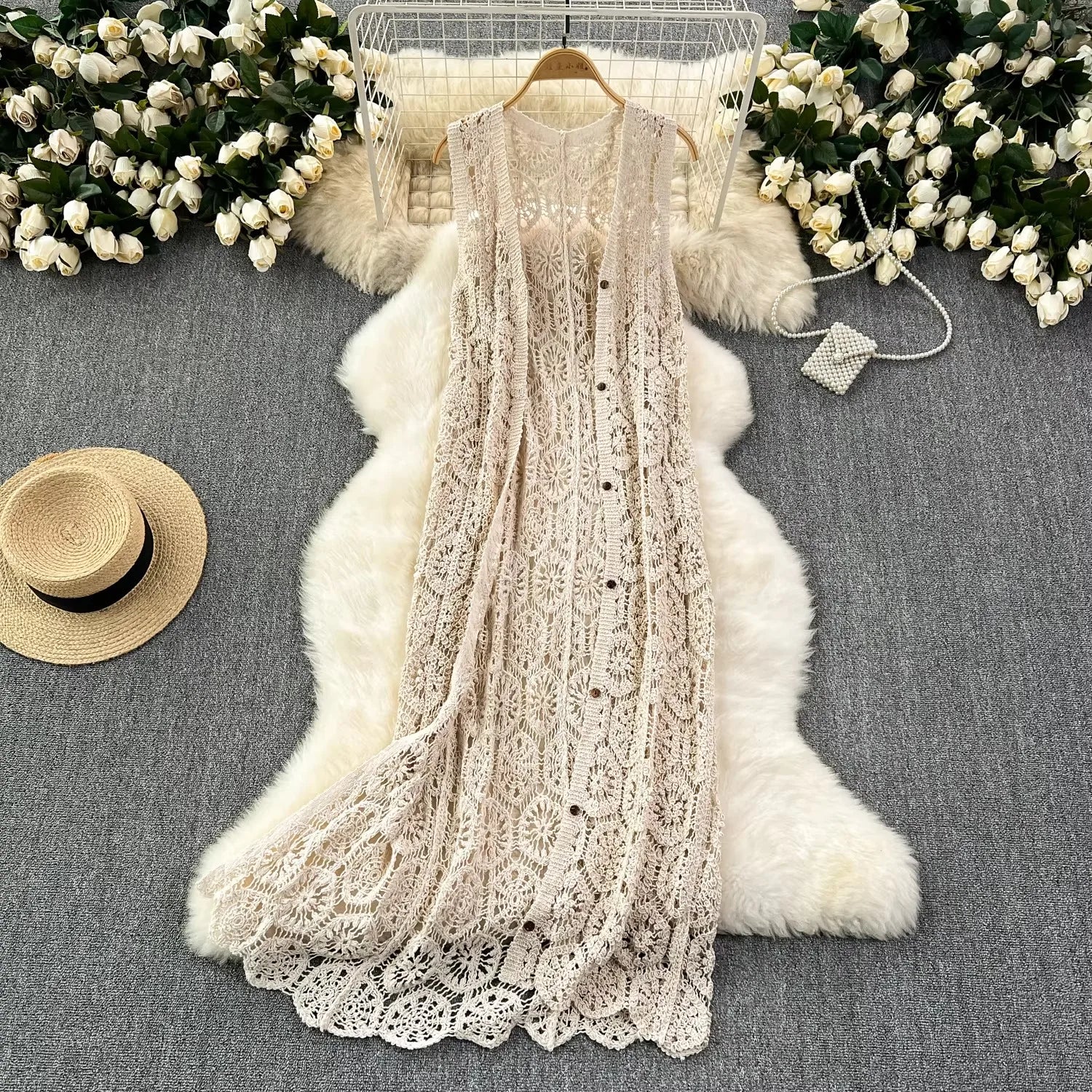Longline Crochet Cardigan Button Front Sleeveless Sheer Open-knit Long Cover-up Jacket Women Summer Beach Vacation Outfit