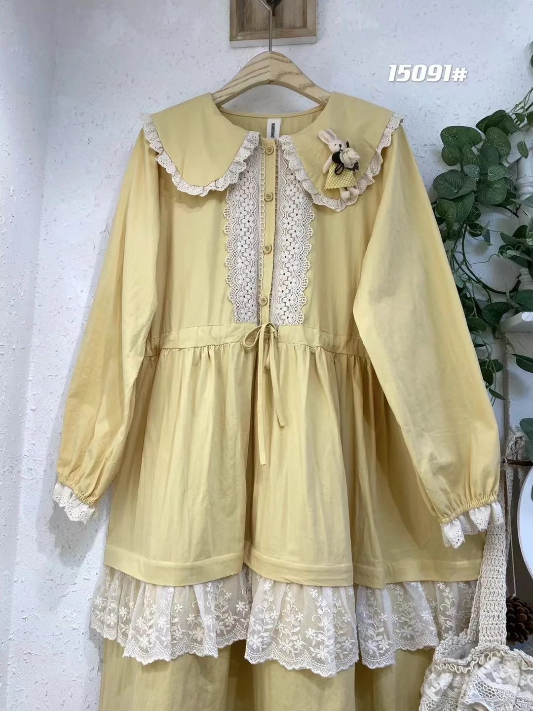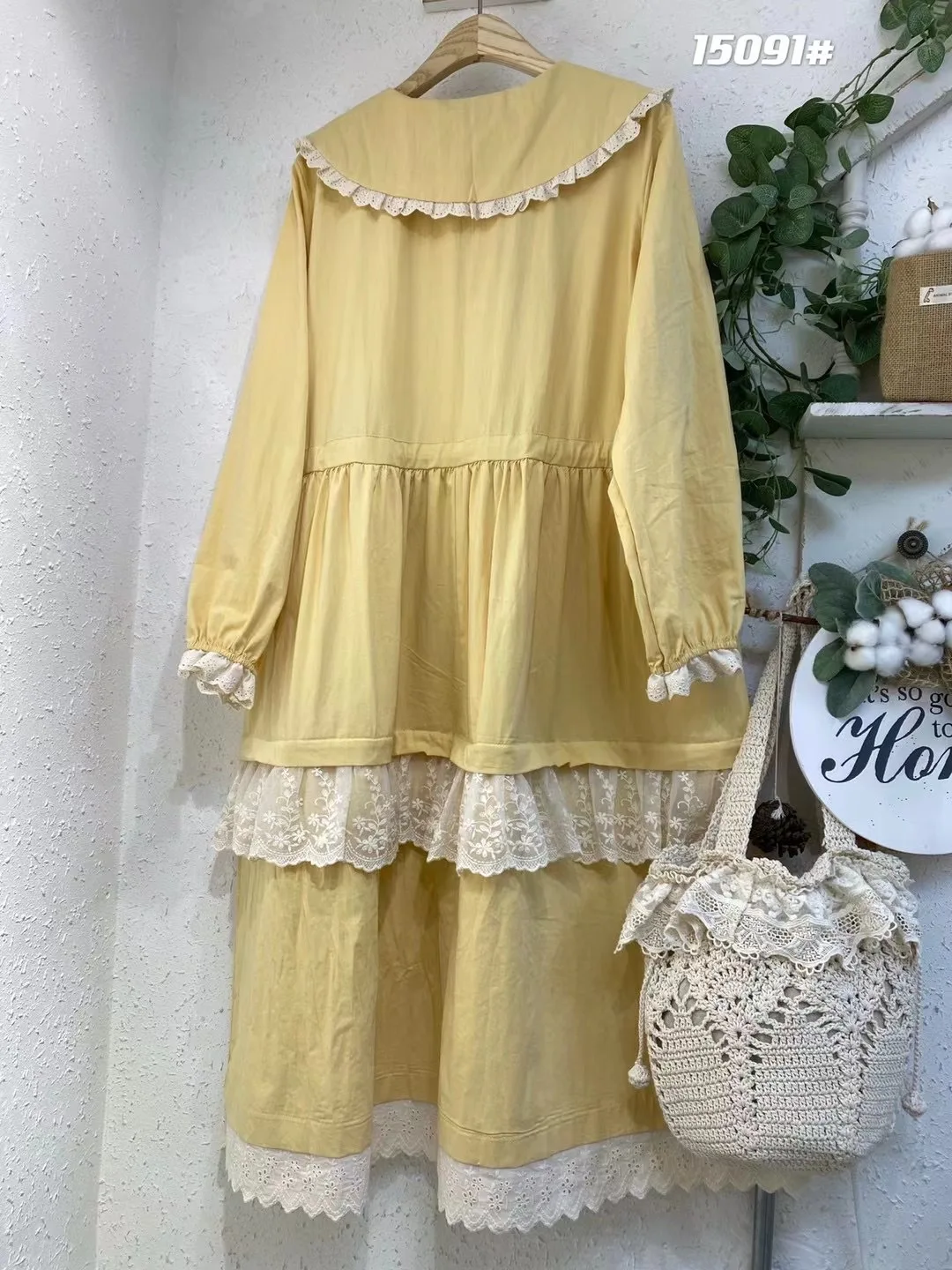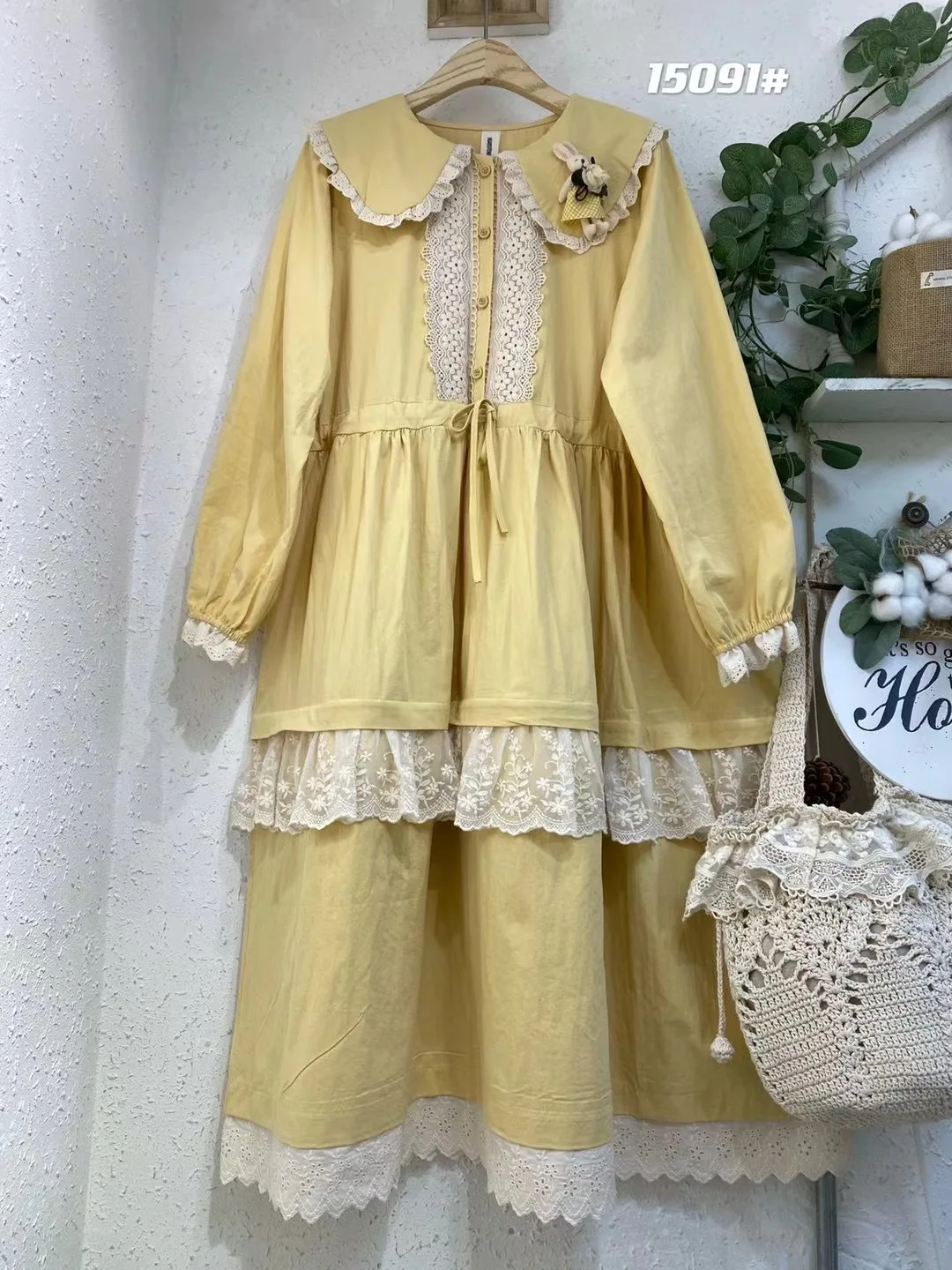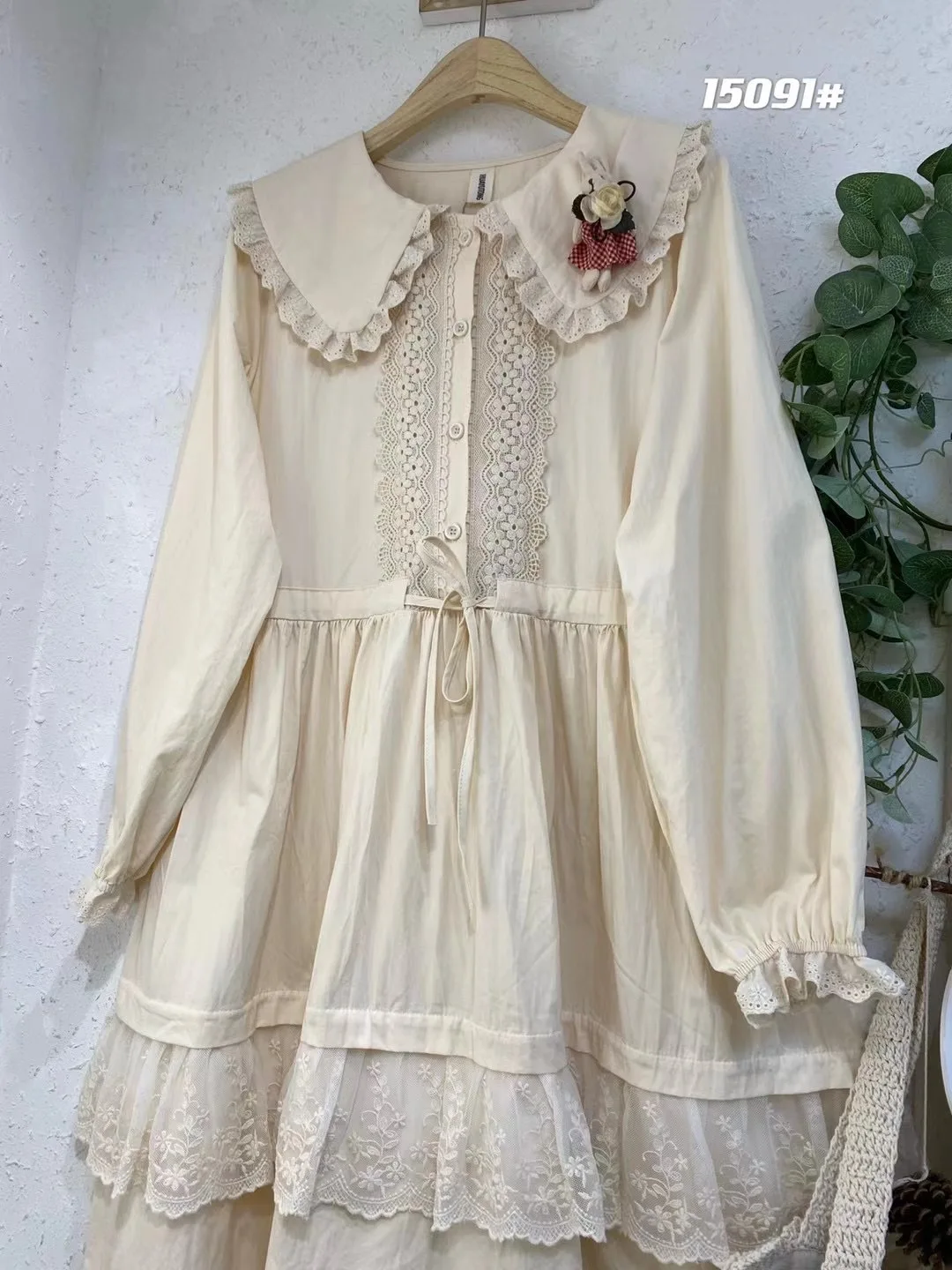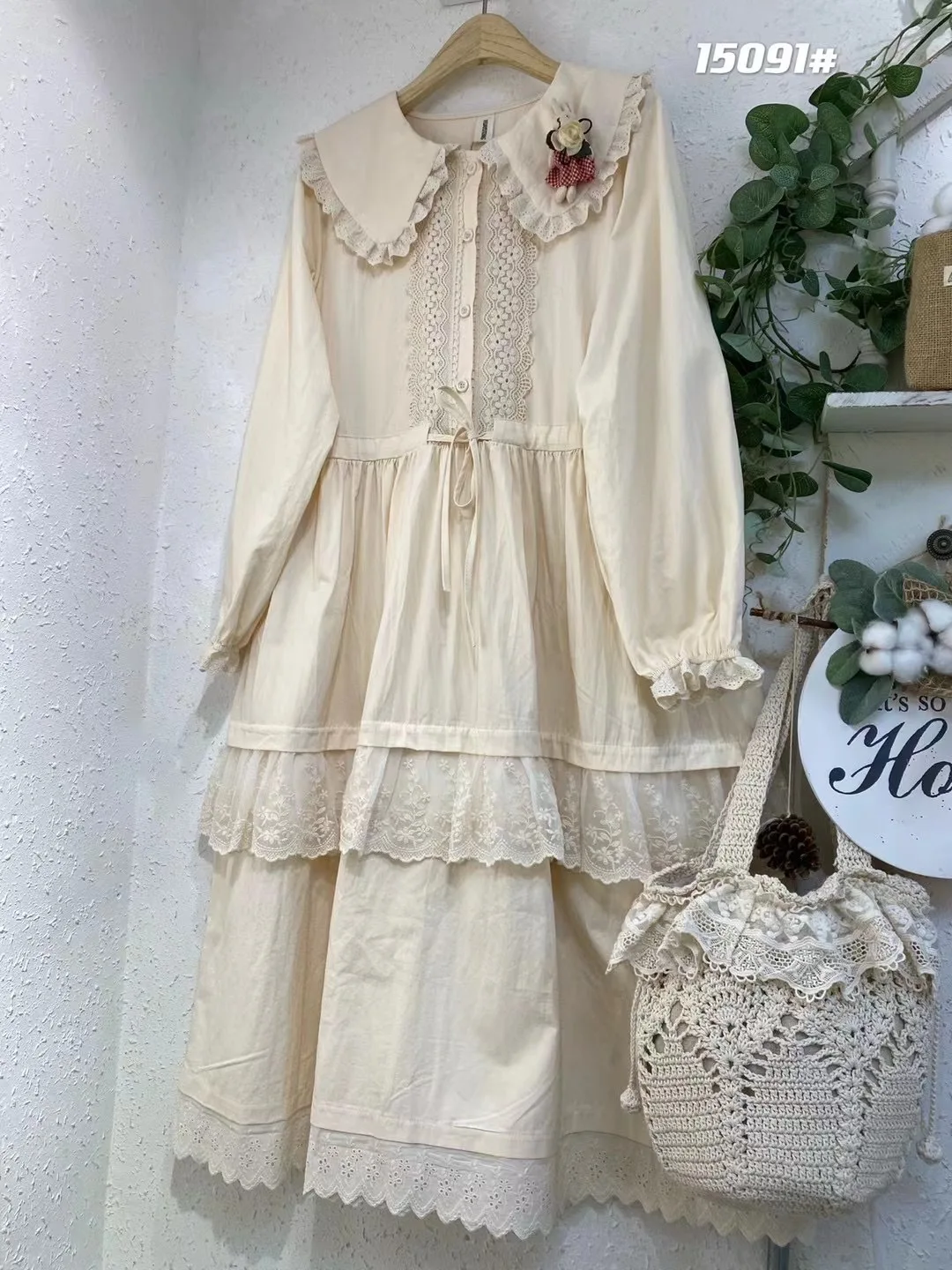 Mori Girl Lace Ruffles Patchwork Dress for Women, Sweet Peter Pan Collar, Kawaii Long Sleeve Dress, Japanese Cotton Linen Loose