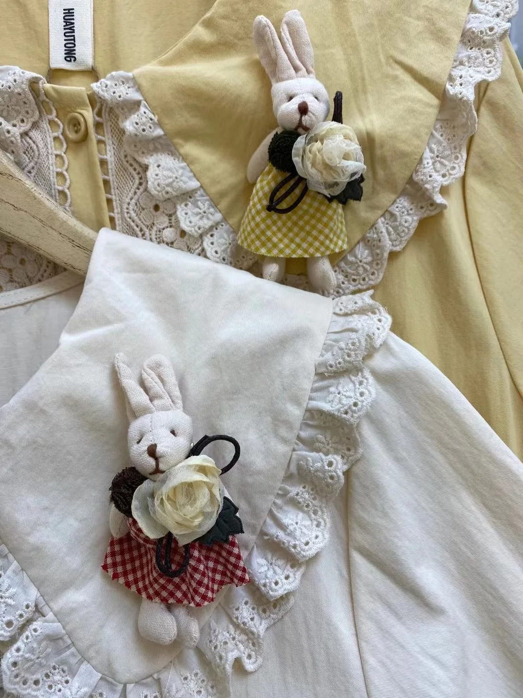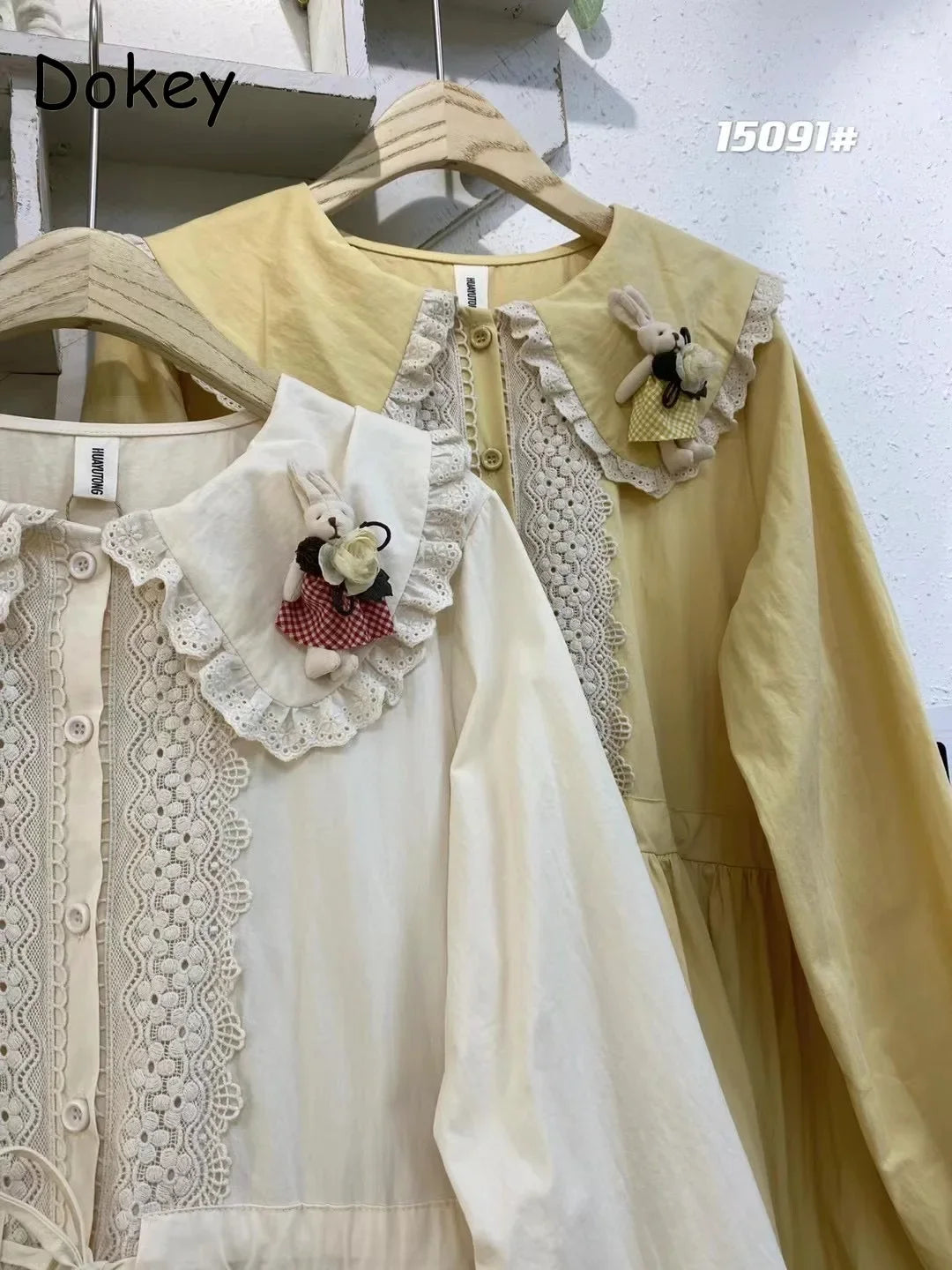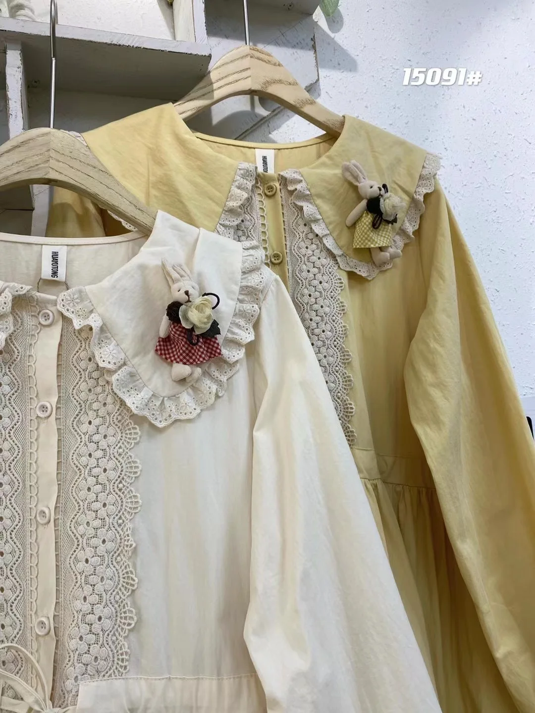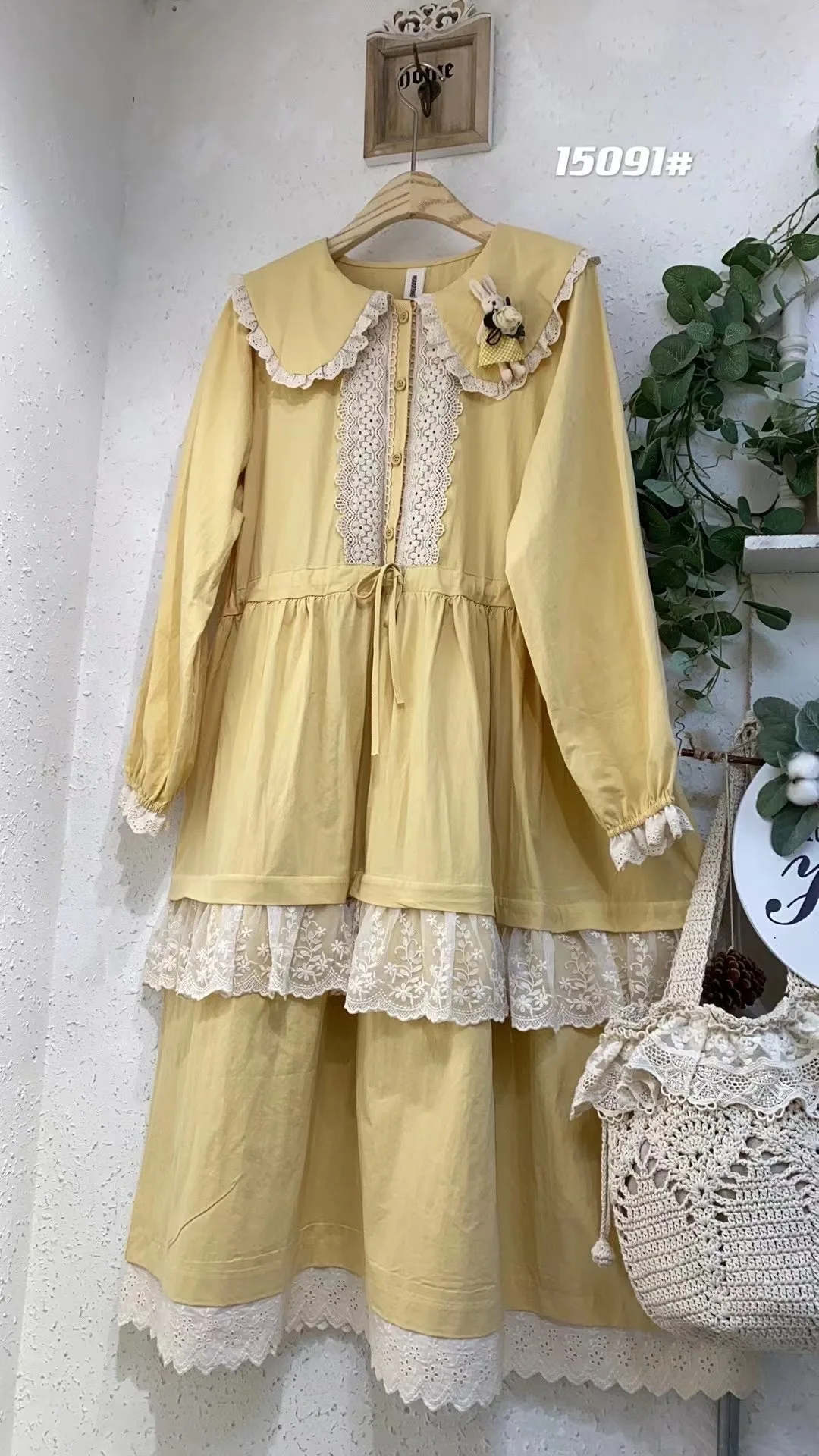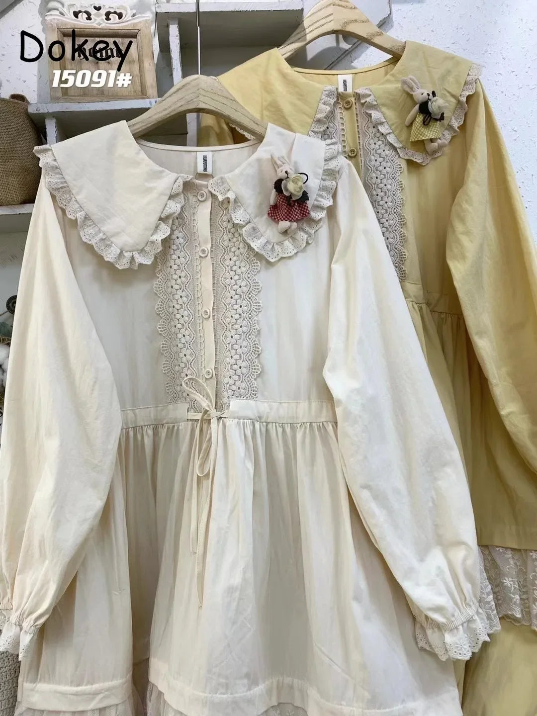Mori Girl Lace Ruffles Patchwork Dress for Women, Sweet Peter Pan Collar, Kawaii Long Sleeve Dress, Japanese Cotton Linen Loose
