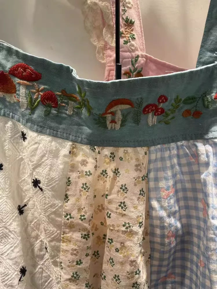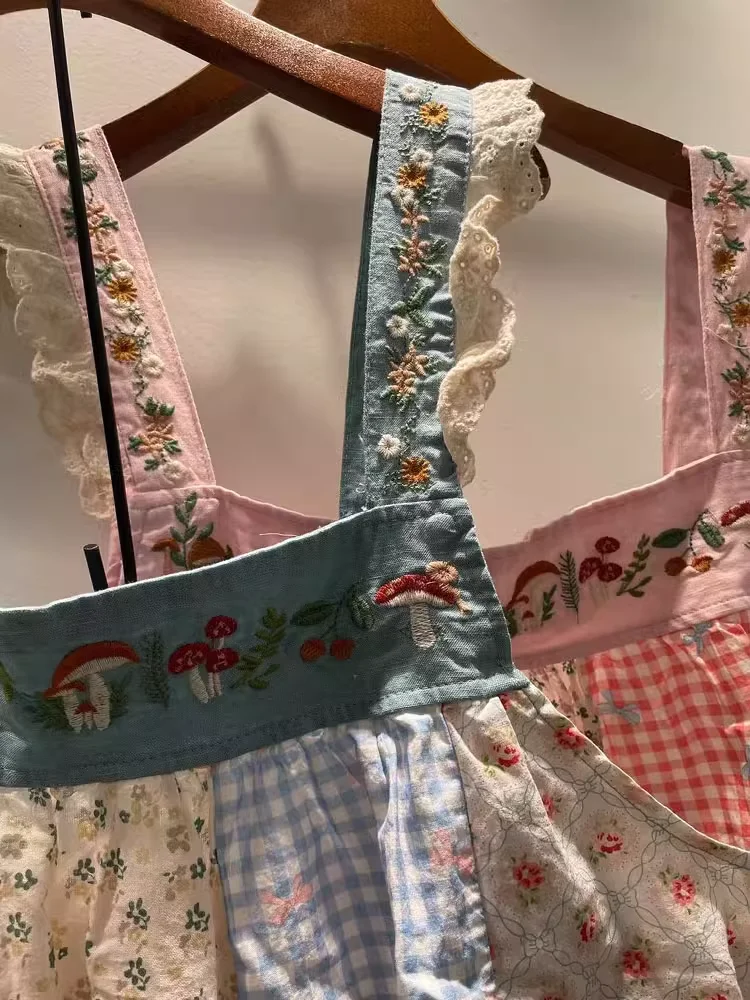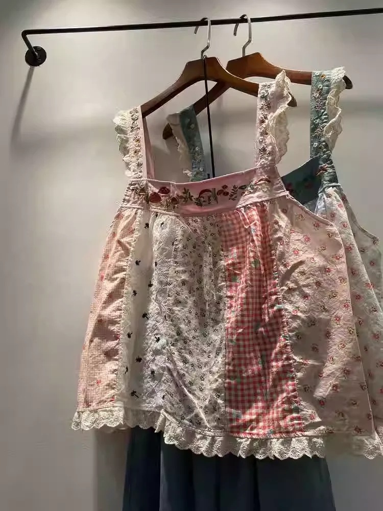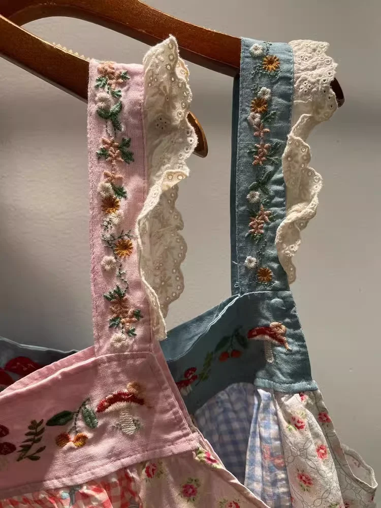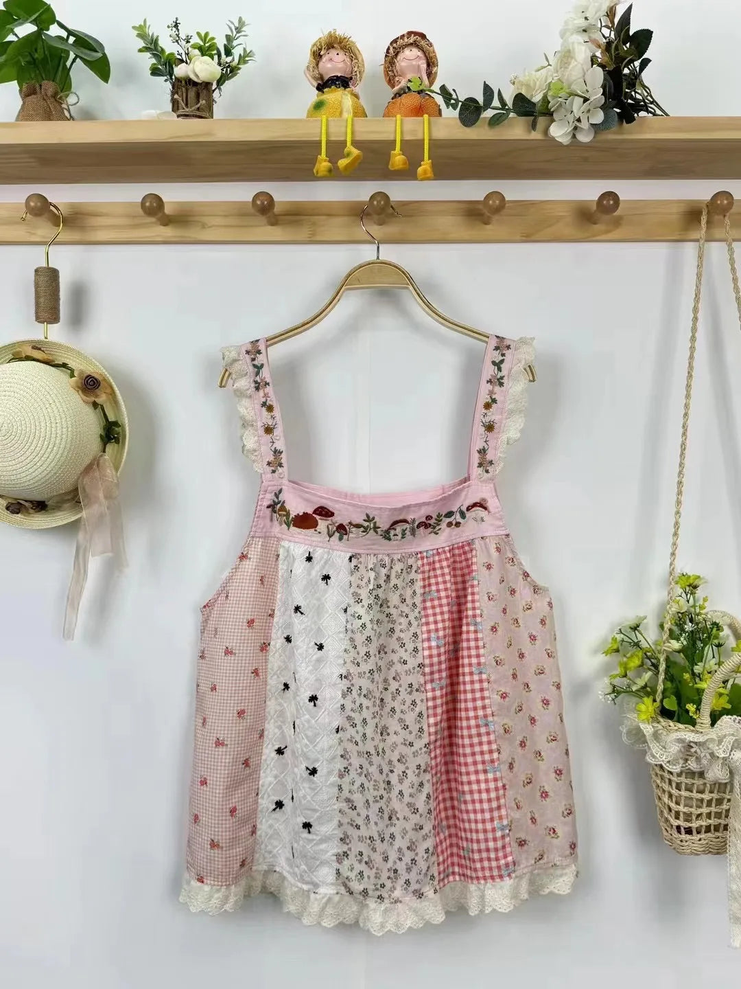 Mori kei Japan fashion sweet lace check print patchwork camisole for women kawaii mushroom embroider cotton halter top