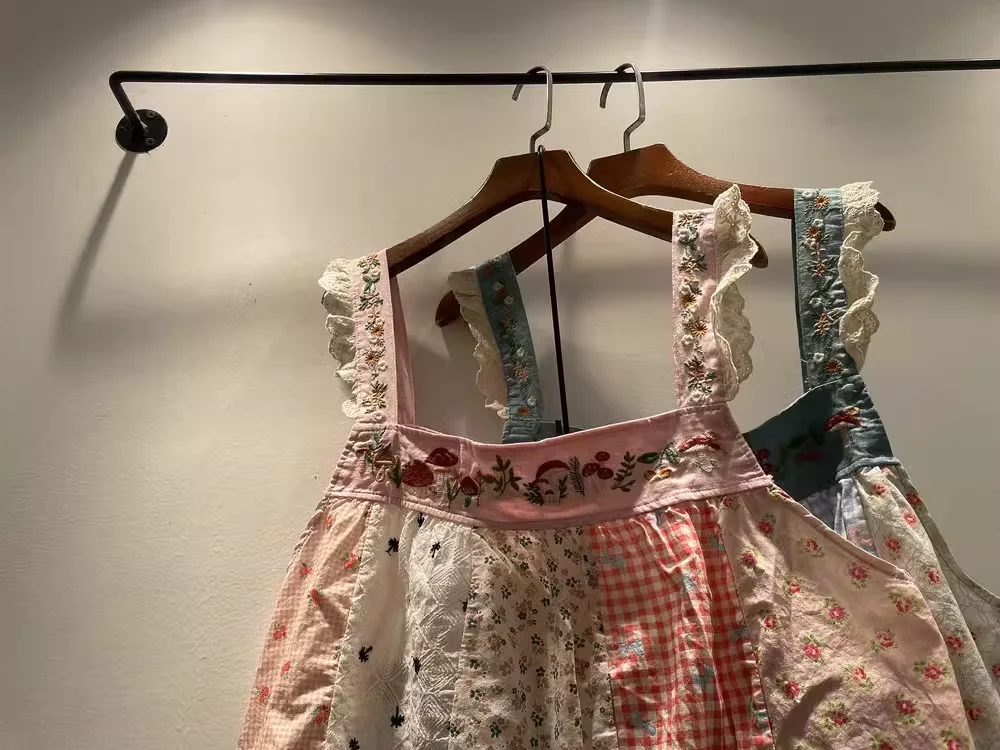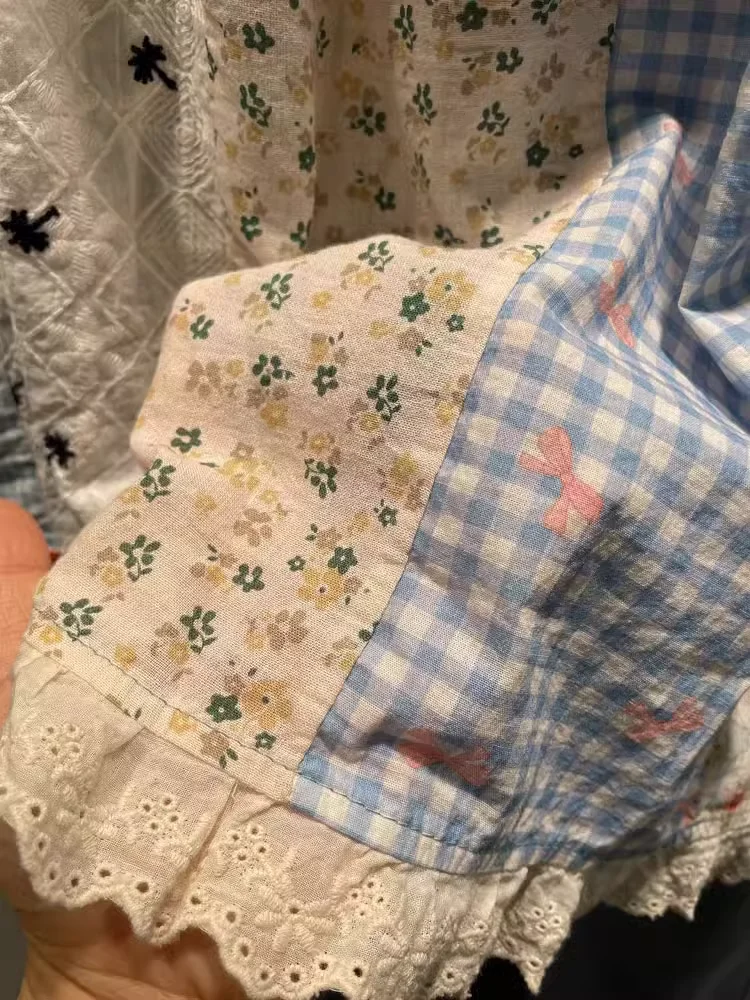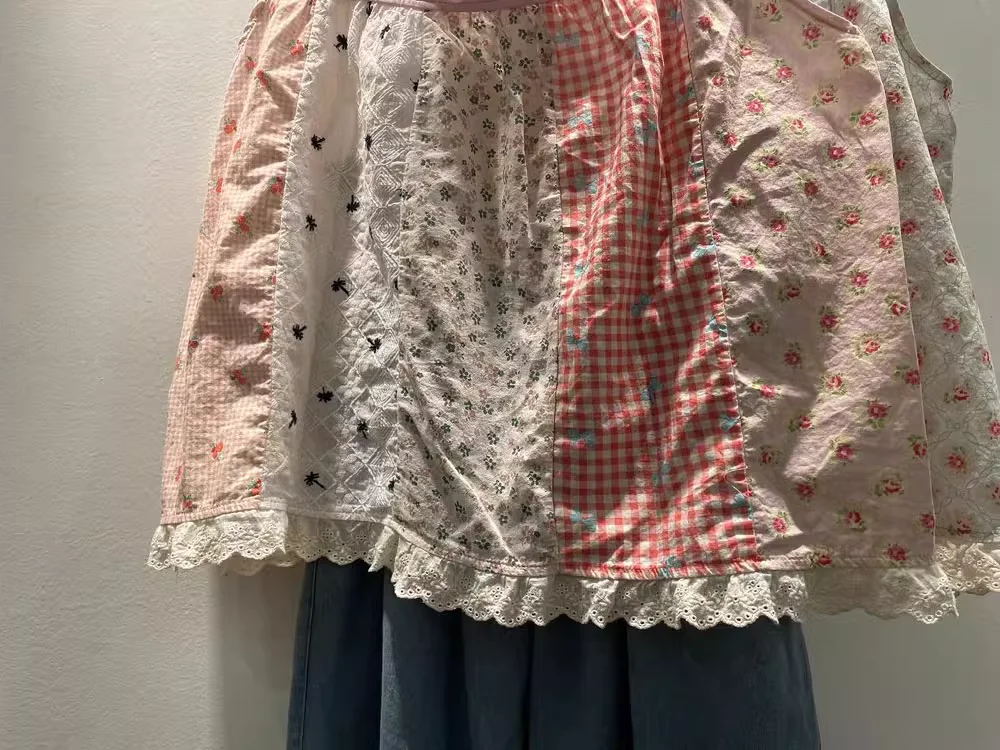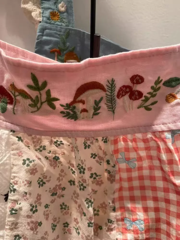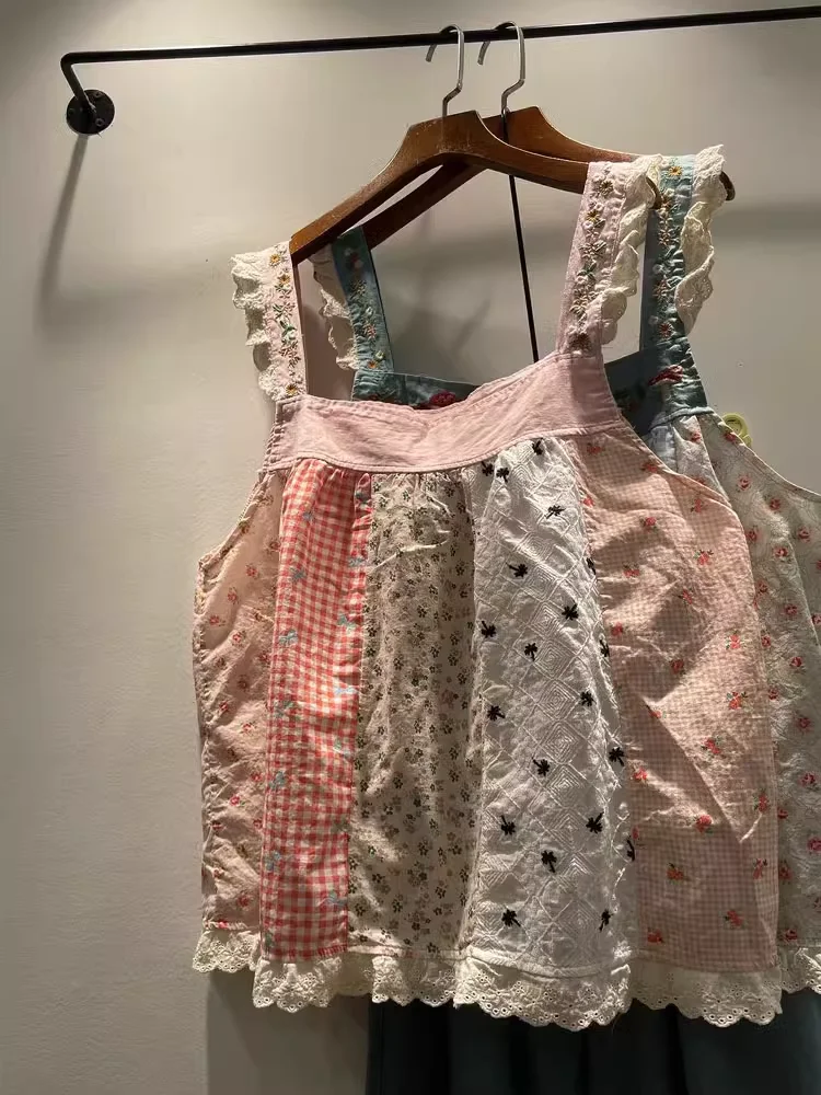 Mori kei Japan fashion sweet lace check print patchwork camisole for women kawaii mushroom embroider cotton halter top