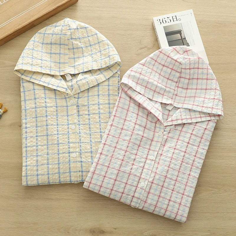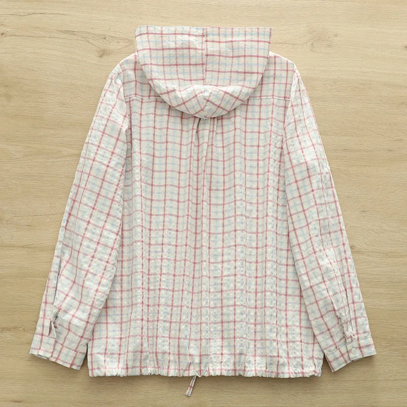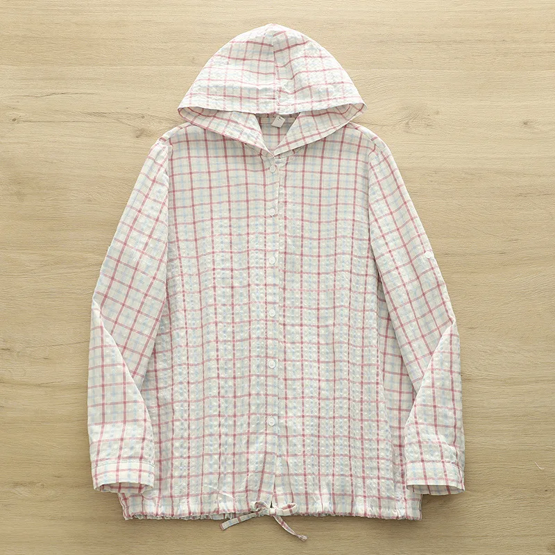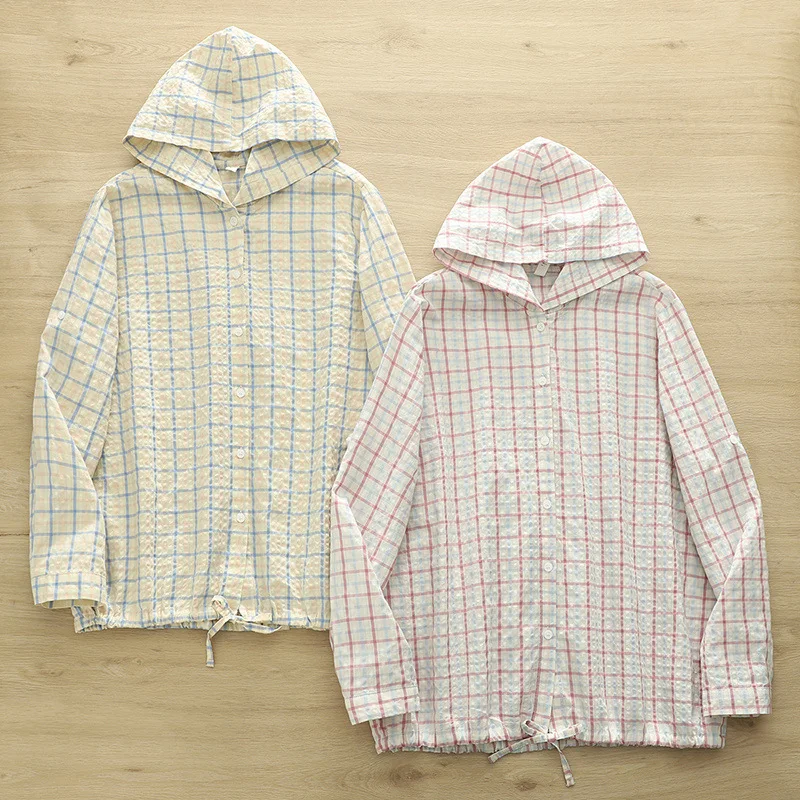 New 2025 Autumn Bubble Cotton Hooded Shirt, Women Long Sleeve Plaid, Mori Girl Casual Versatile Sunscreen Loose Blouse