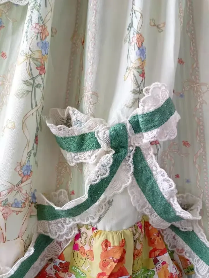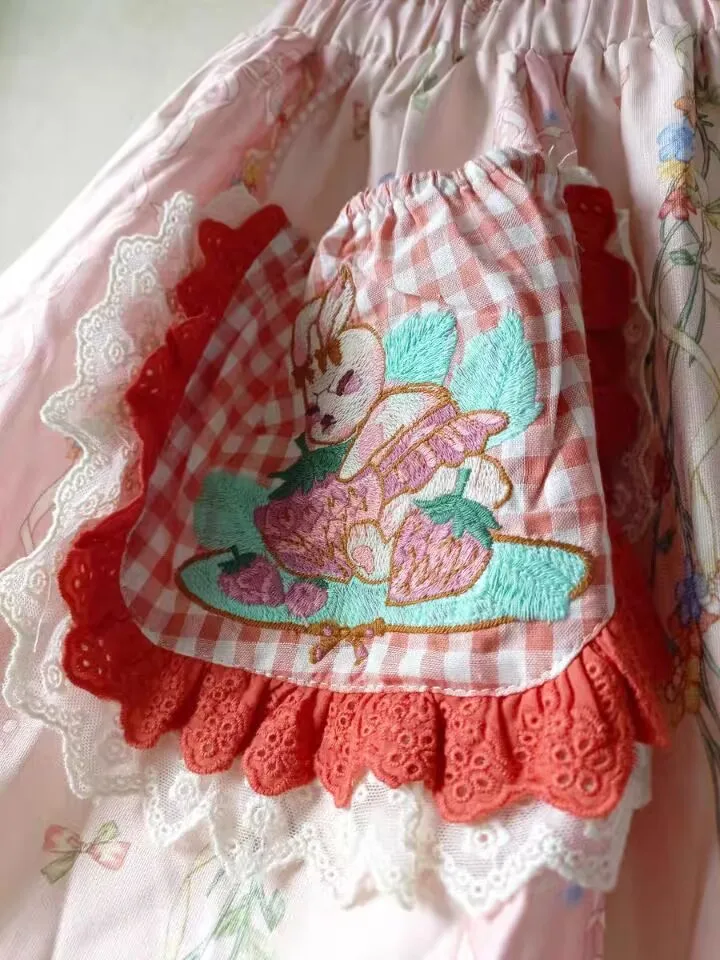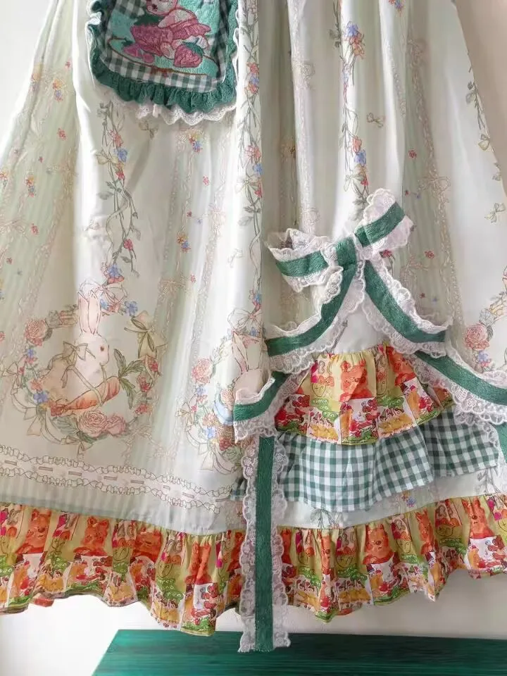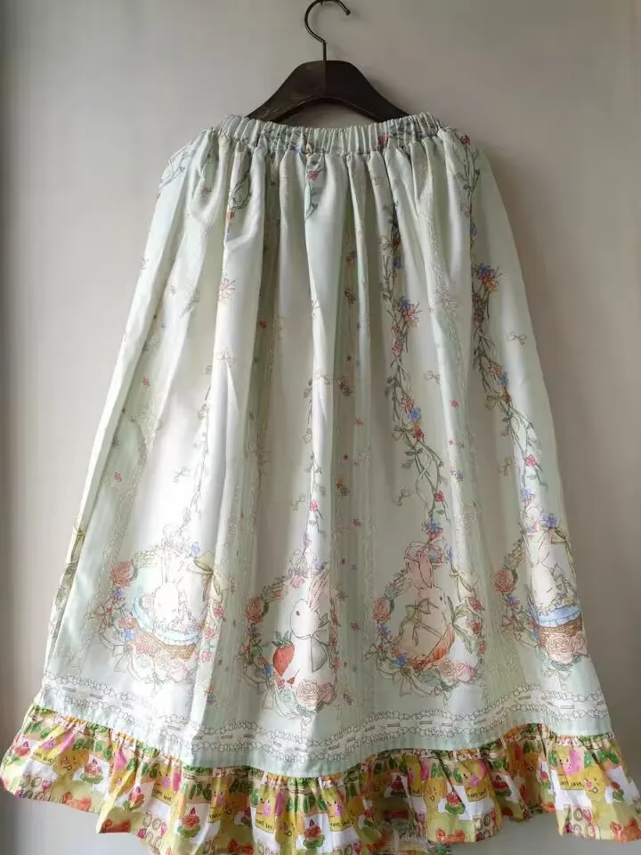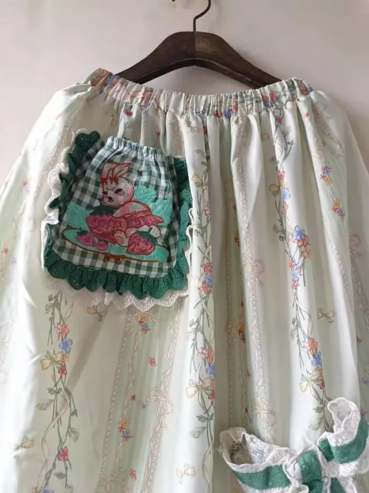 Mori Girl Sweet Lolita Long Skirt Women's Lace Splicing Elastic Waist Skirt Vintage Rabbit Embroidery Skirt