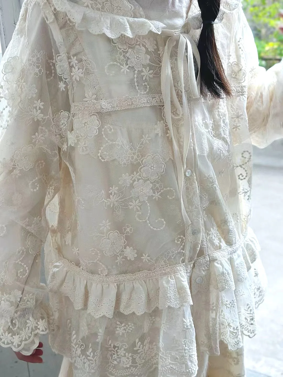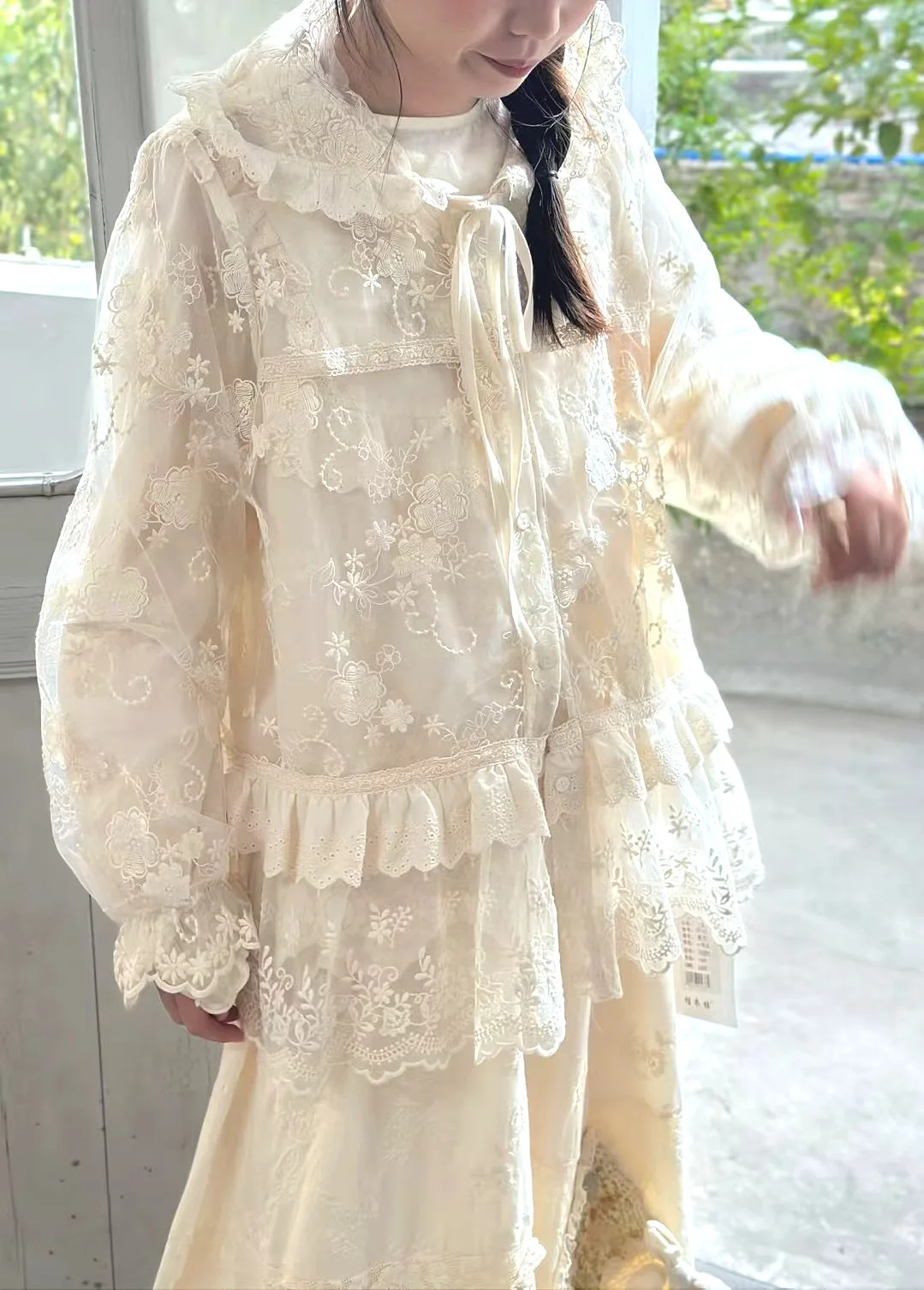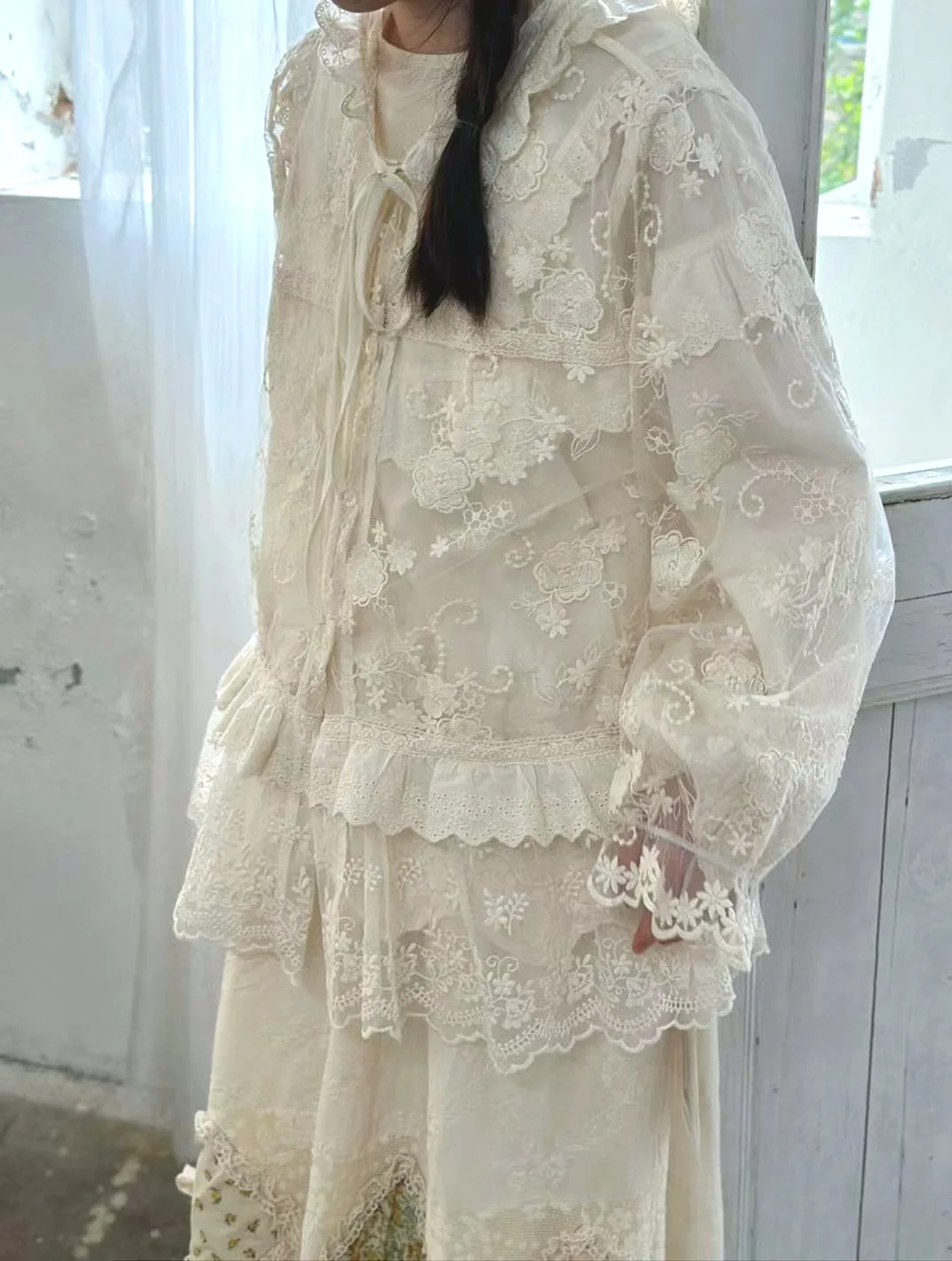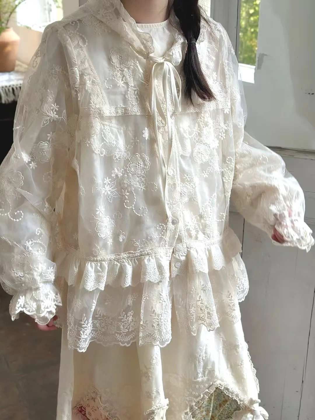 Embroidered Lace Hooded Ruffled Lace-up Jacket