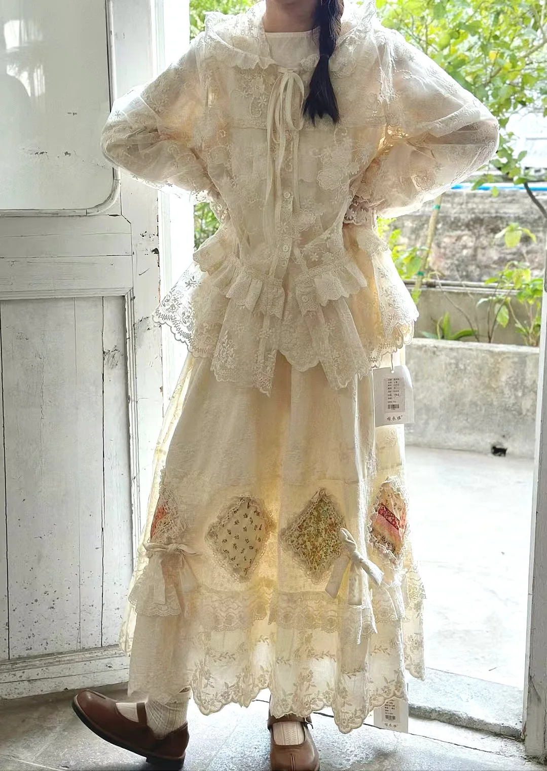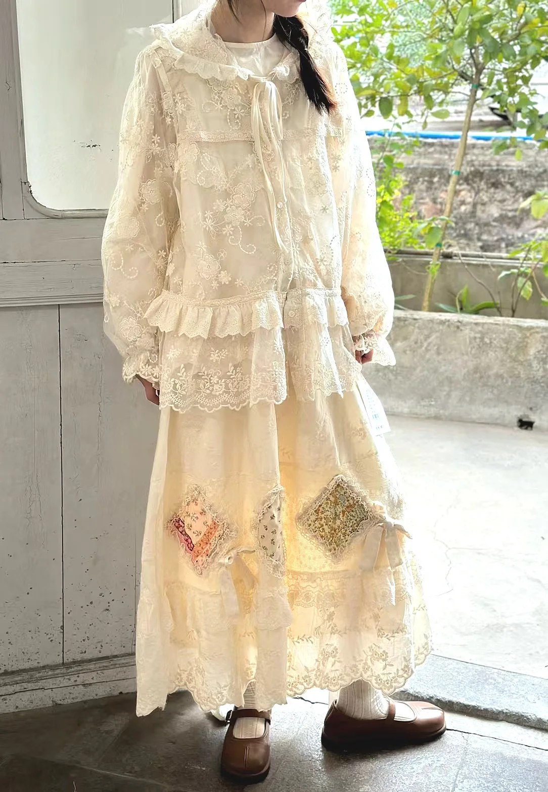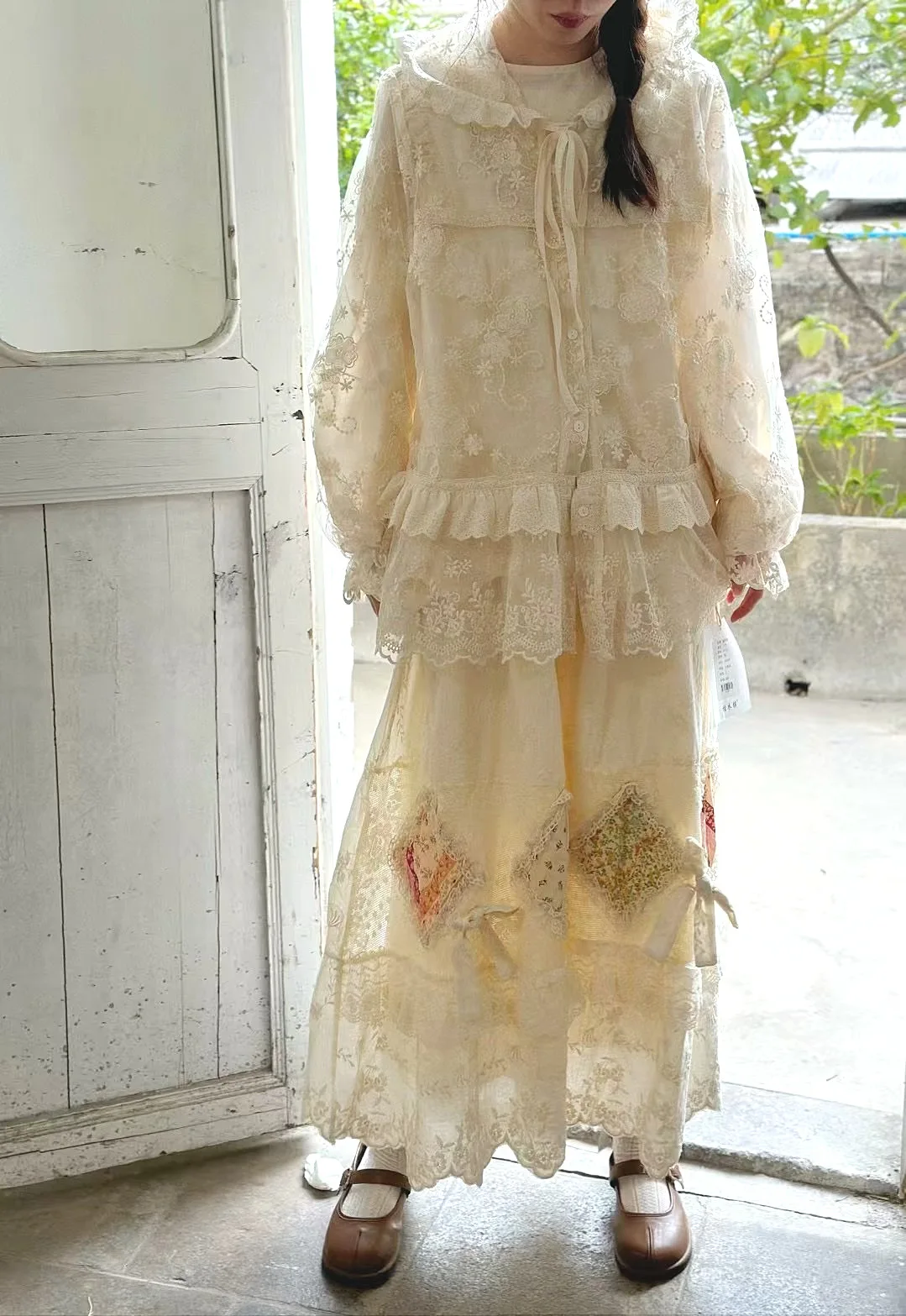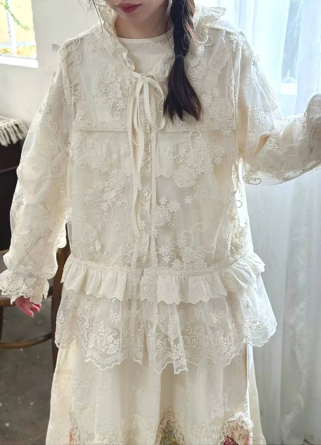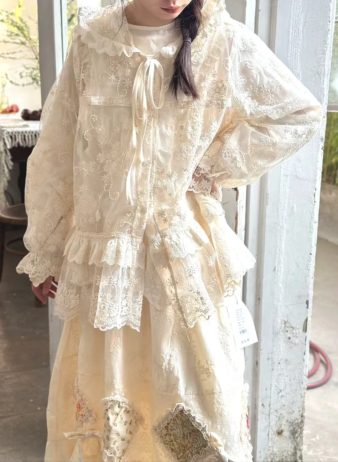 Embroidered Lace Hooded Ruffled Lace-up Jacket