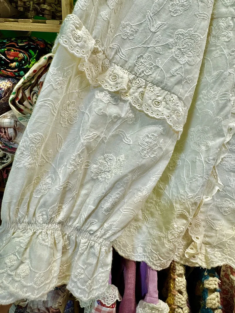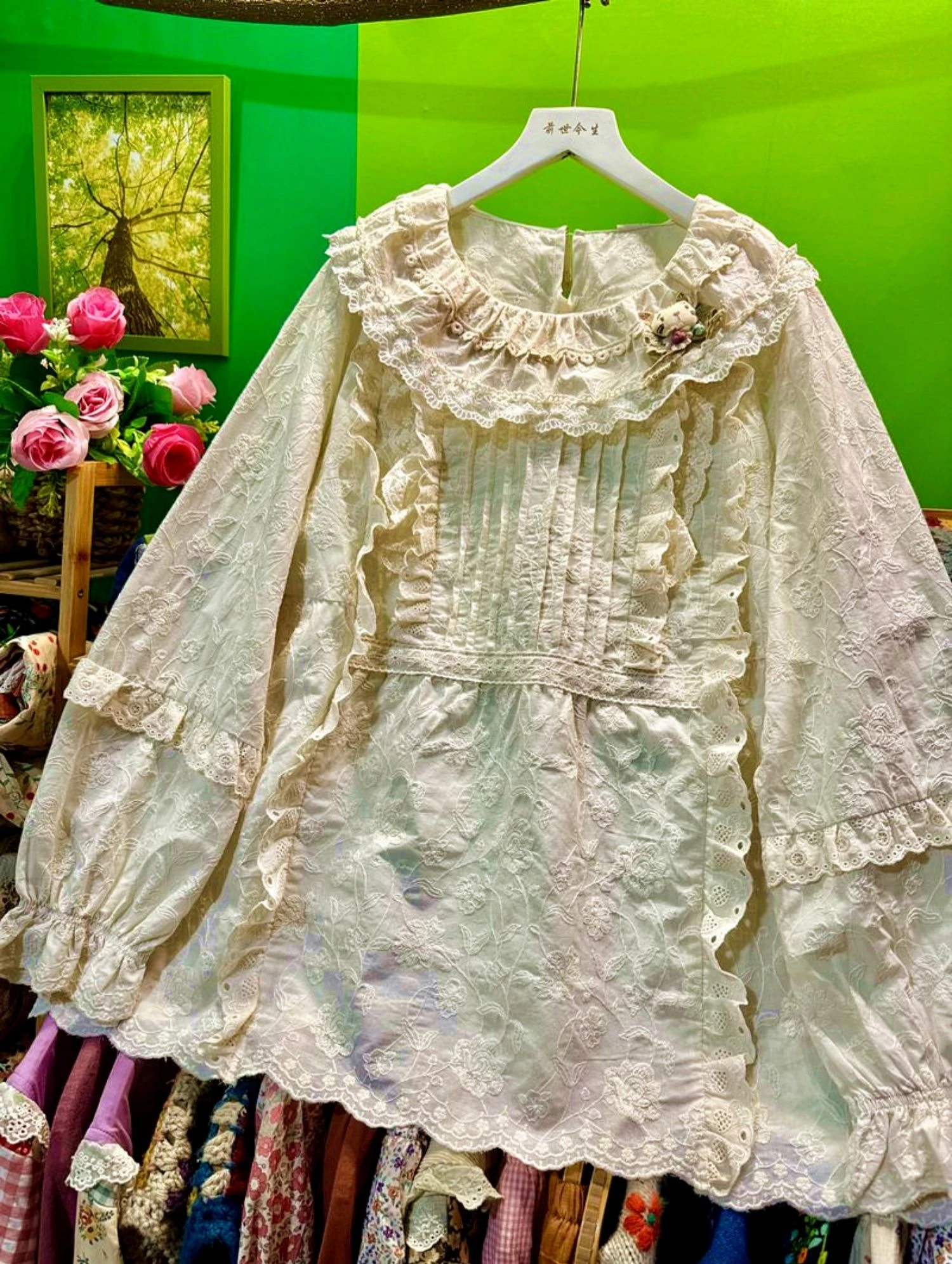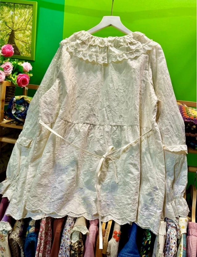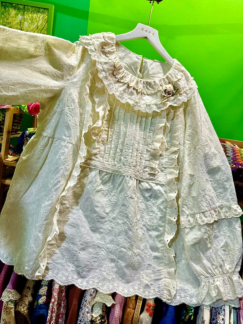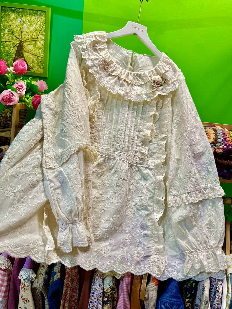 Vintage Autumn Sweet Kawaii Cartton Japanese Mori Girl Cotton Shirt Female Rococo Korean Style Retro Chic Pleated Lace Blouse
