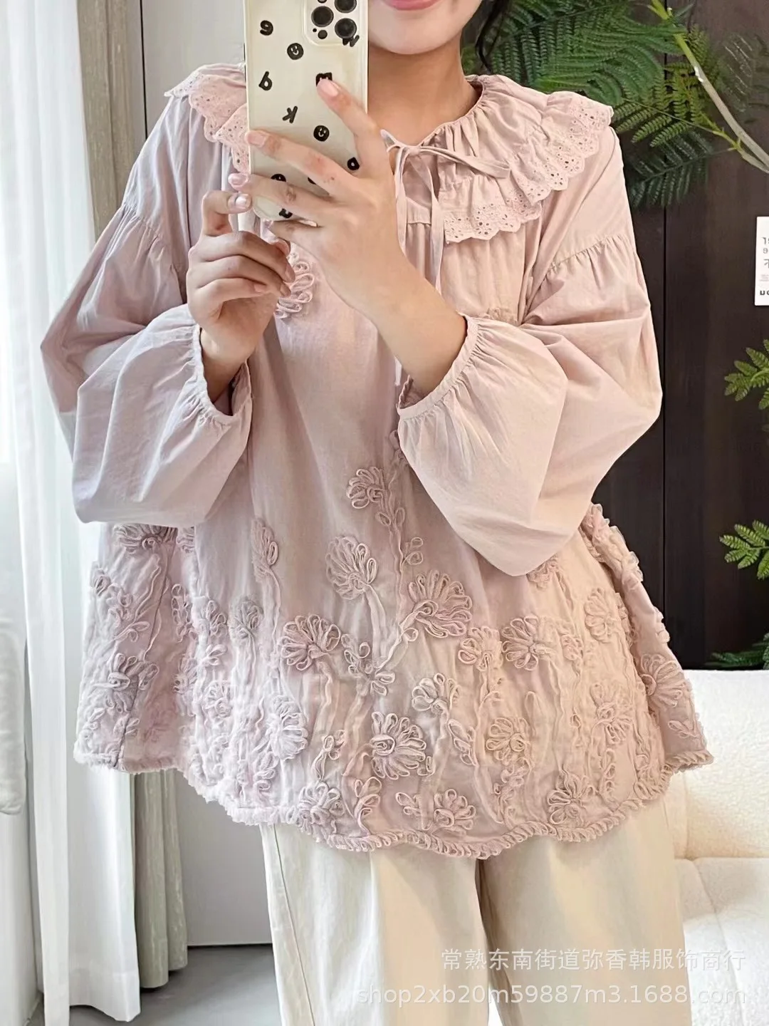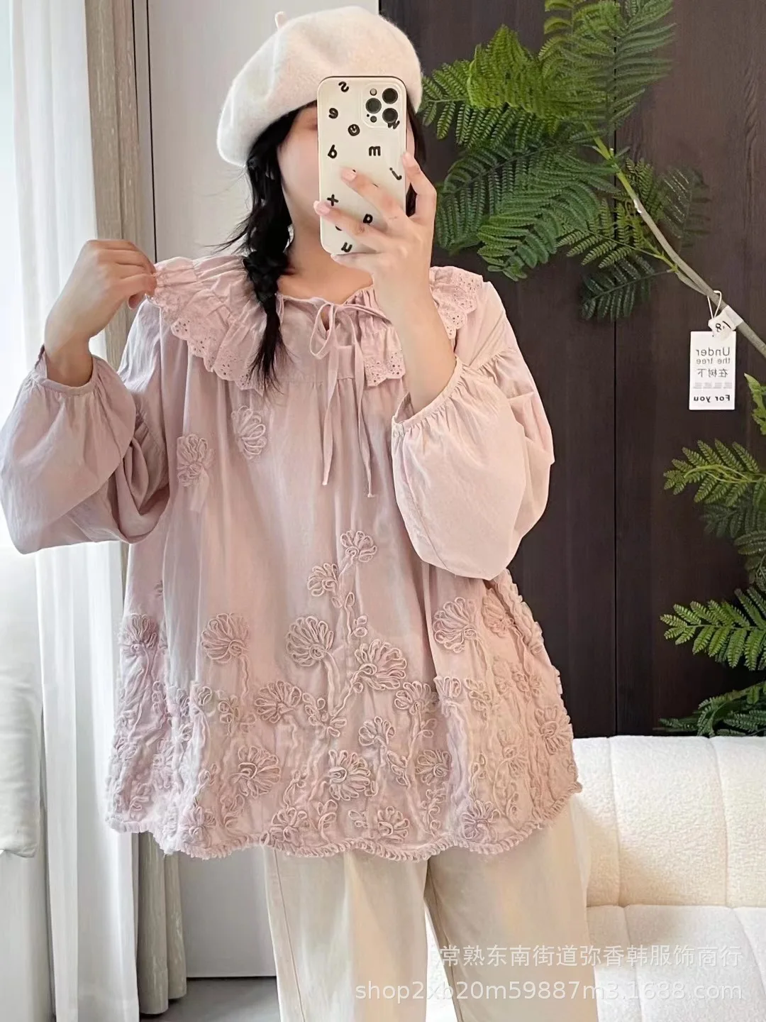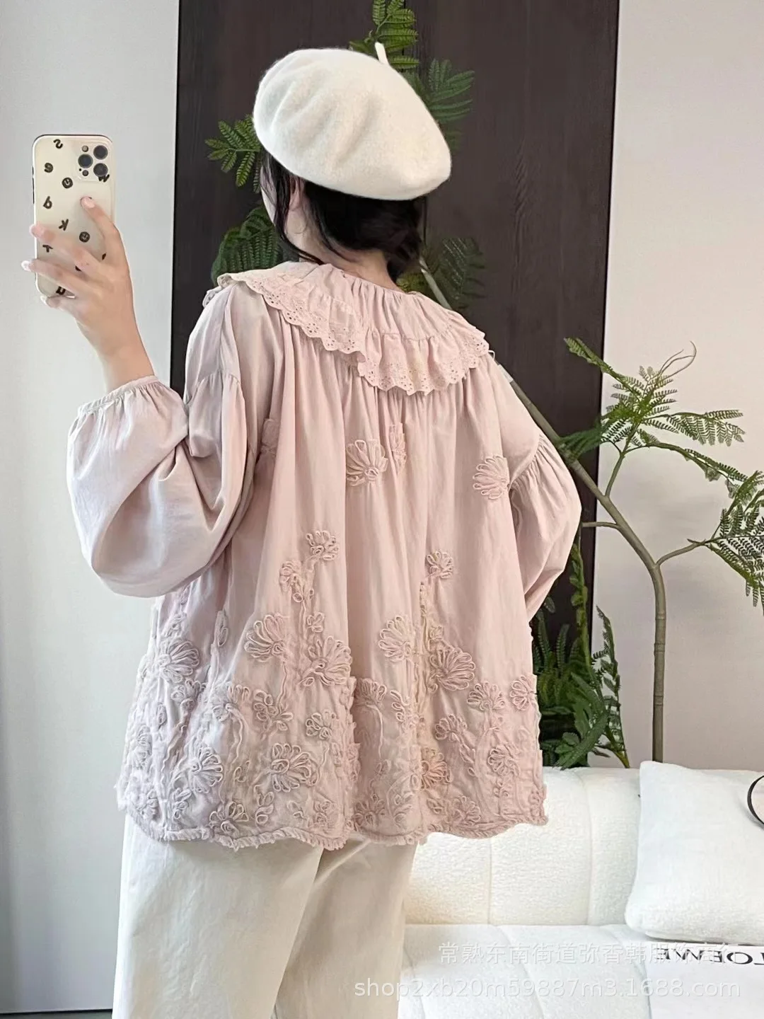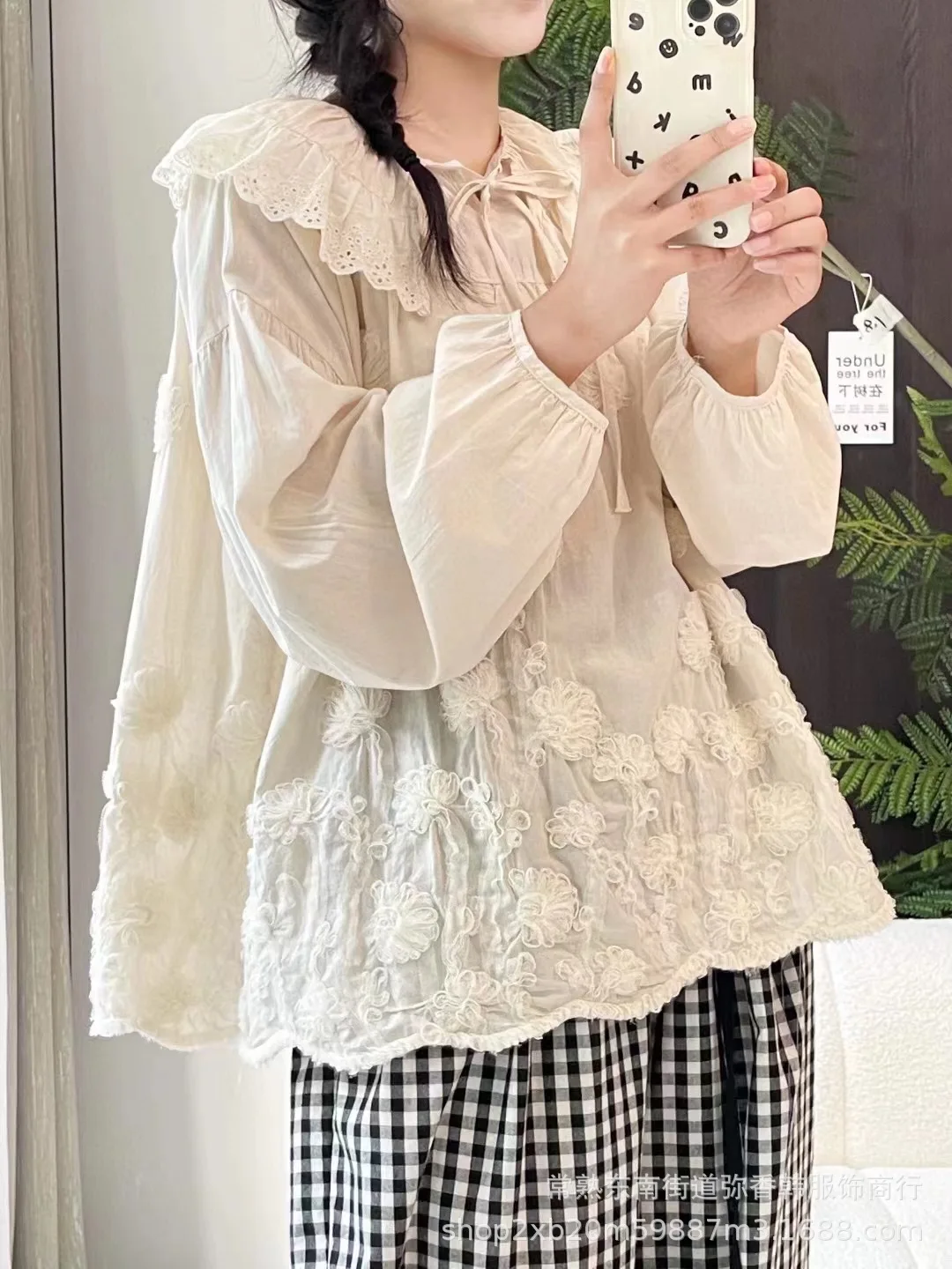 Vintage Embroidery Flower Cotton Linen Shirts Women Spring Summer Japanese Mori Ruffled Lace-up Long Sleeve Blouse Casual Tops