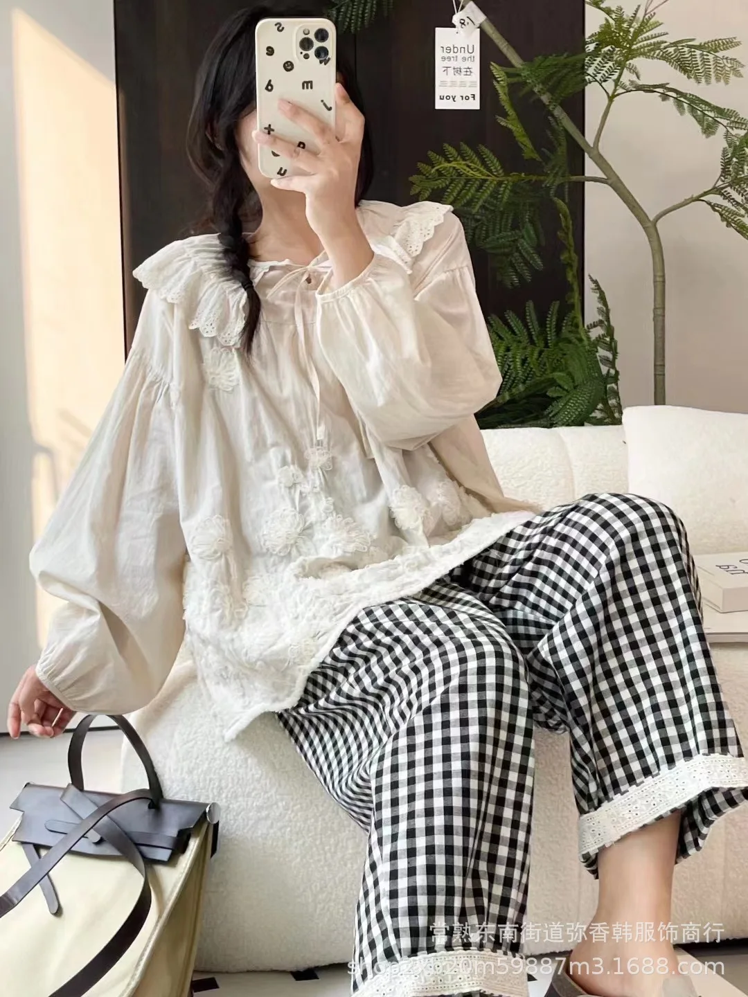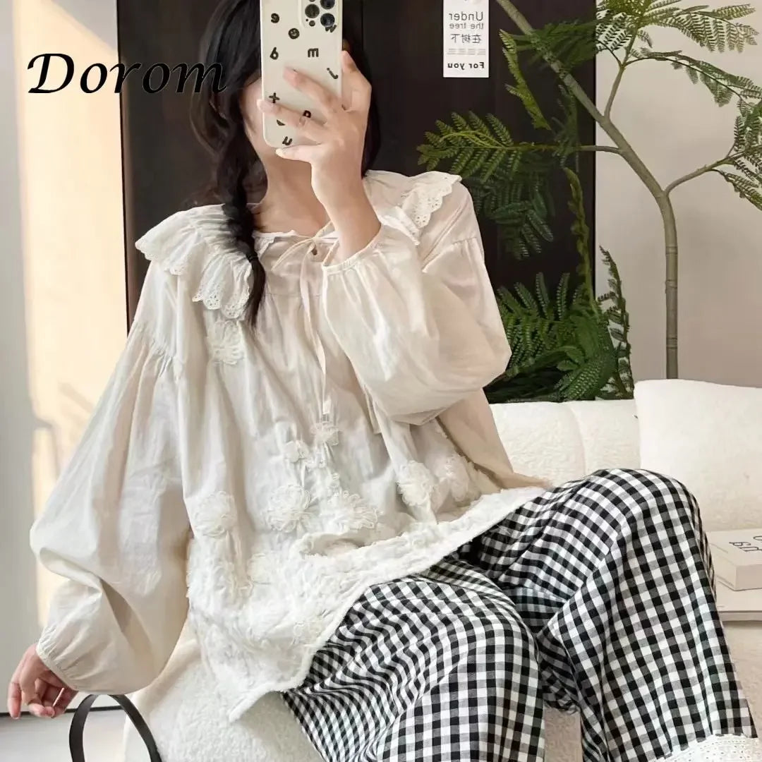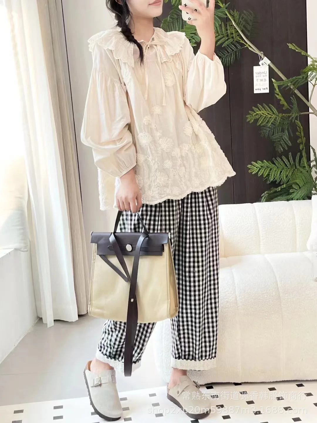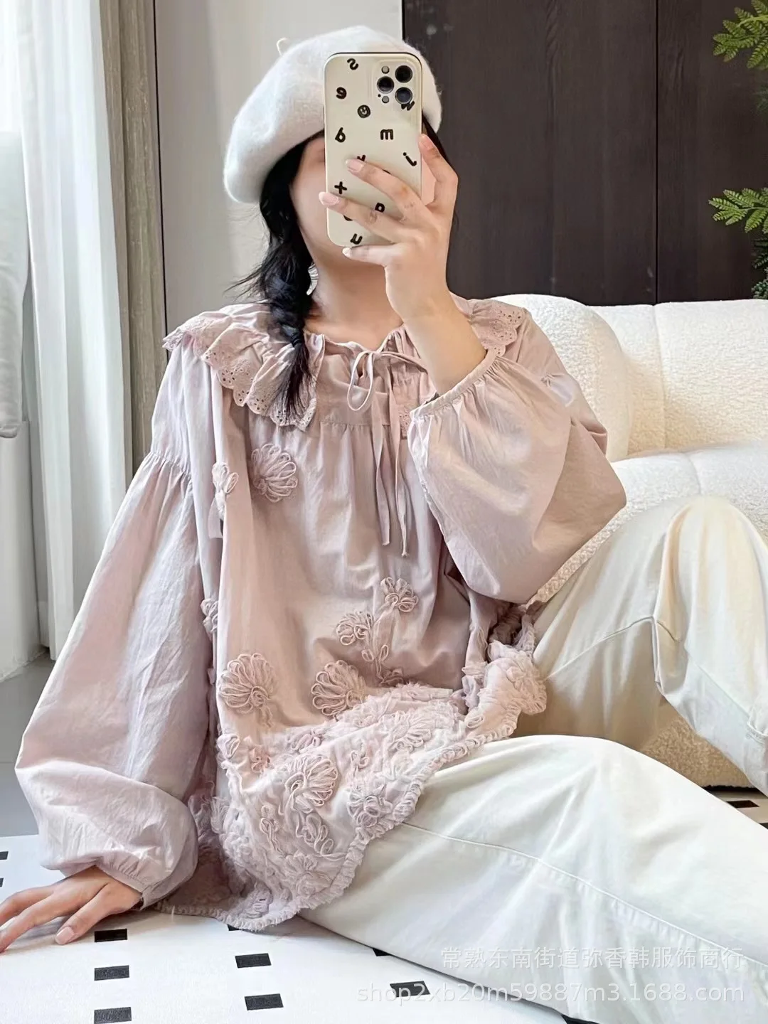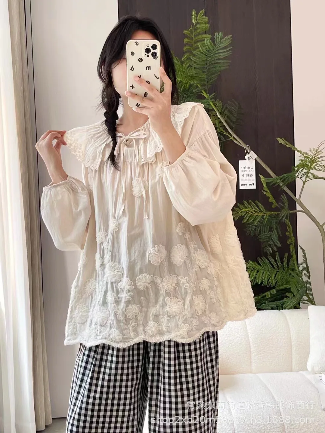 Vintage Embroidery Flower Cotton Linen Shirts Women Spring Summer Japanese Mori Ruffled Lace-up Long Sleeve Blouse Casual Tops