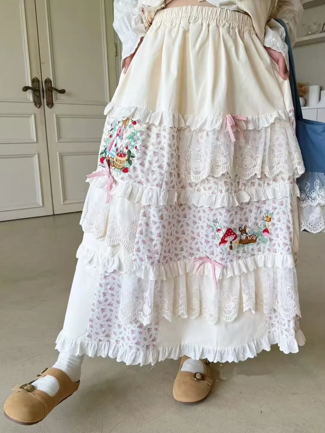 Embroidery Lace Ruffled Cotton Pleated Long Skirt
