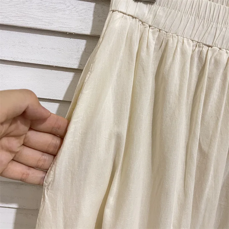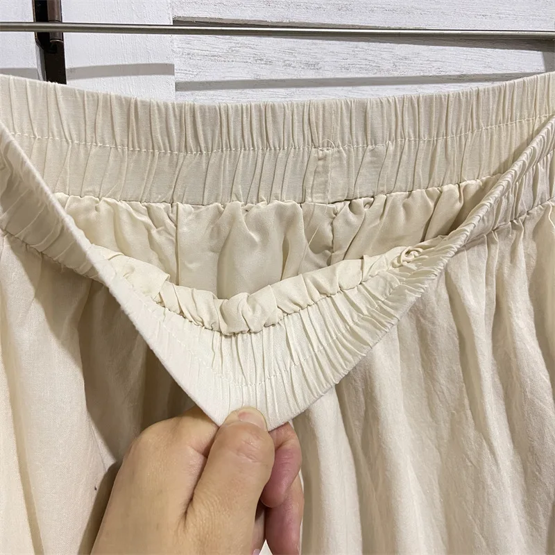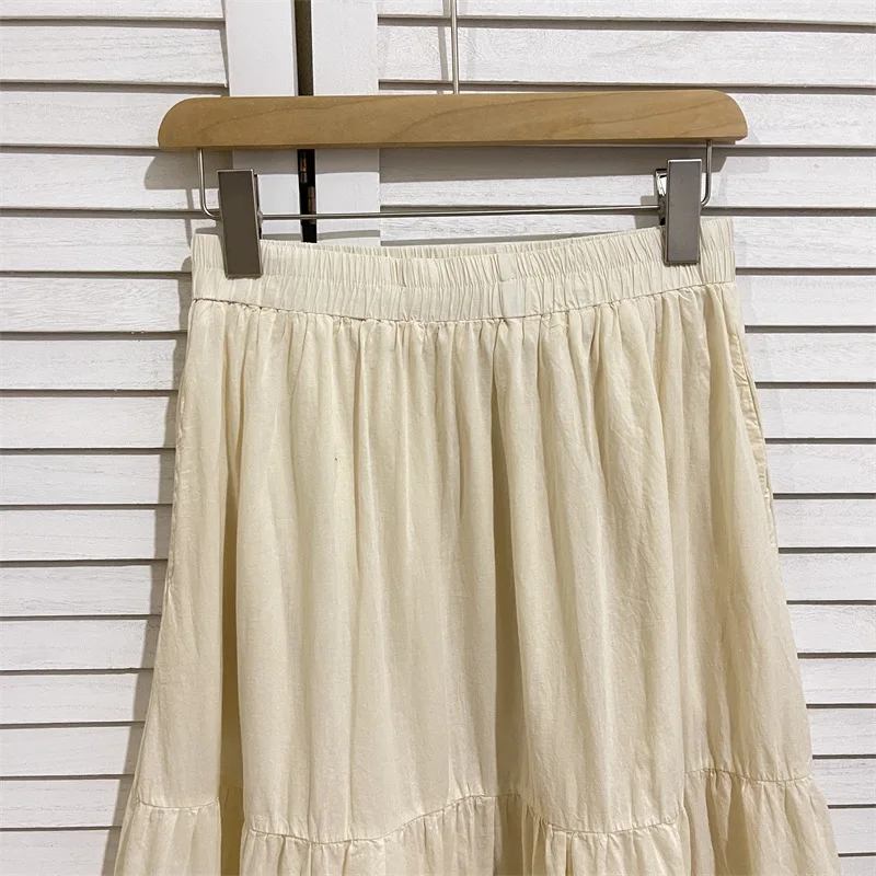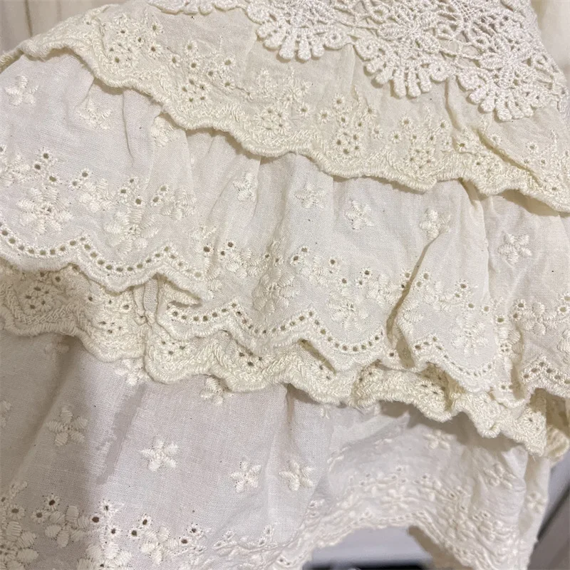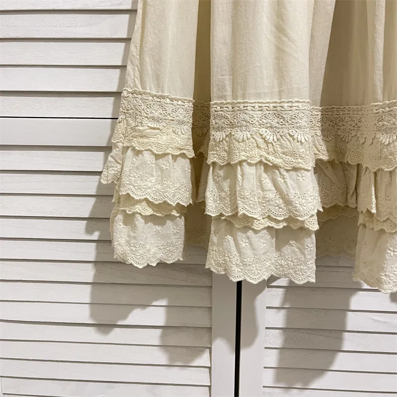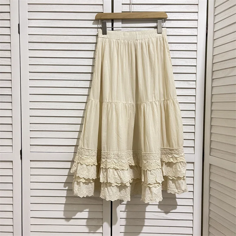 Women Bohemian Elastic High Waist Long Skirt Mori Kei 100% Cotton Lace Embroidery Beige Midi Skirt Boho Clothing