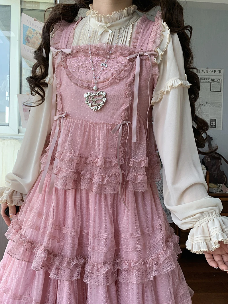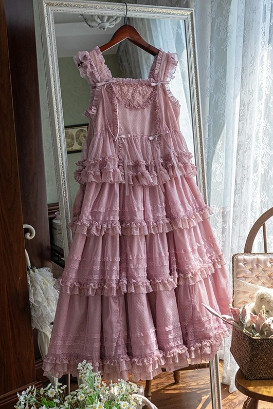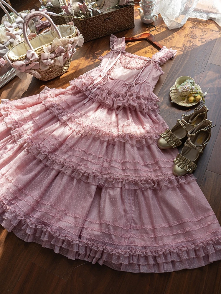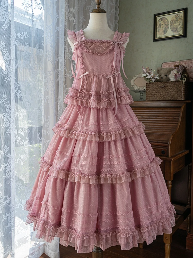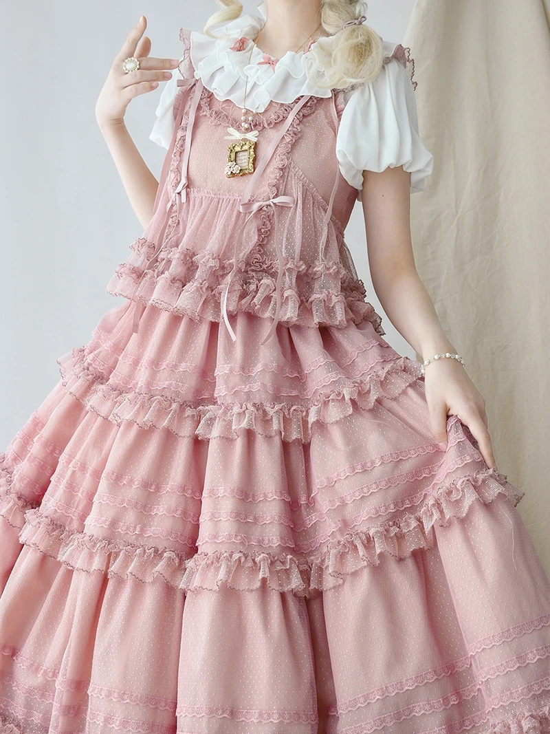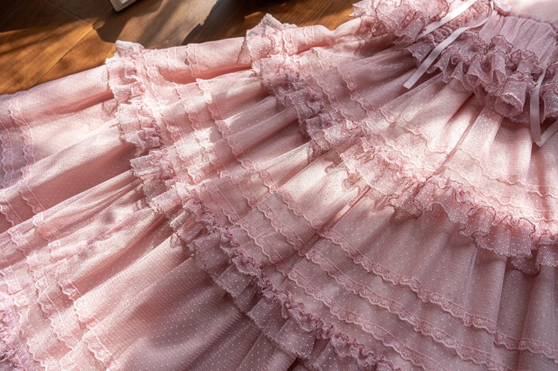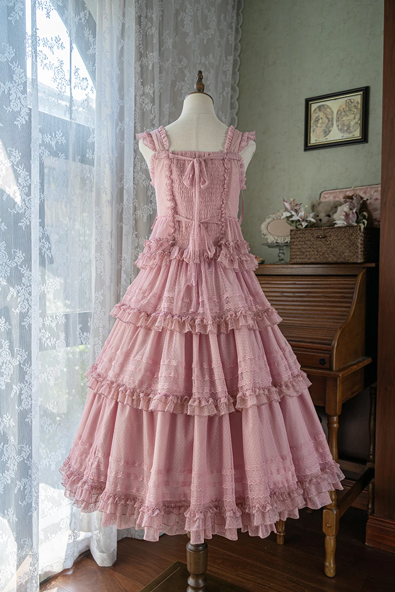 Pink Polka Dot Mesh Lace Multi-layer Long Dress
