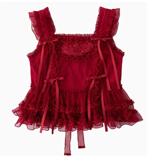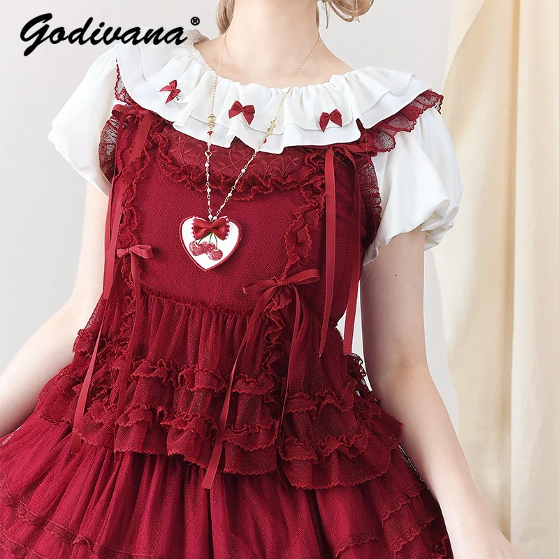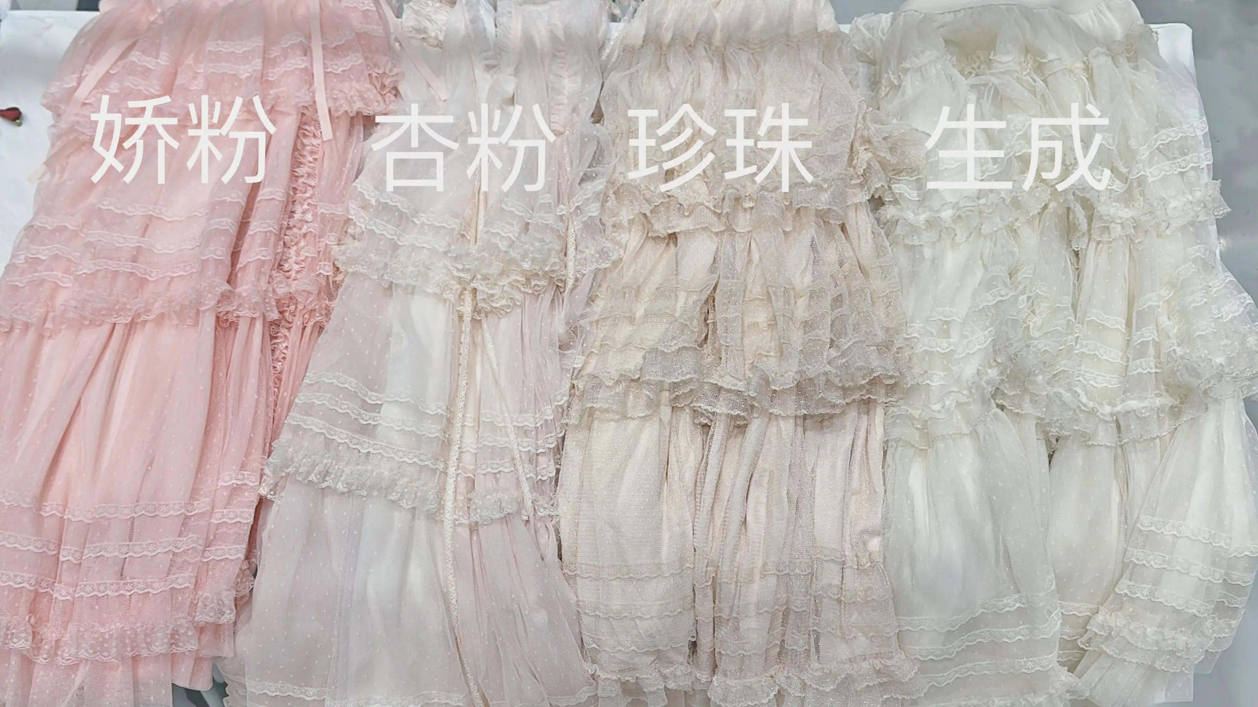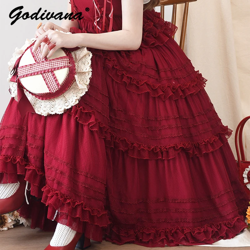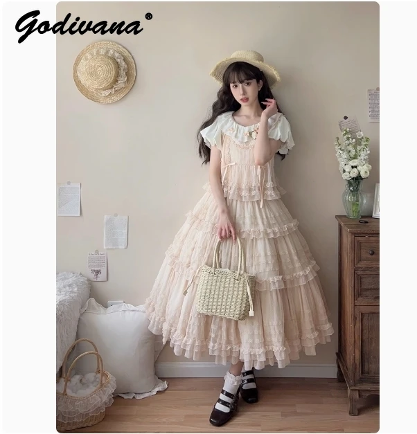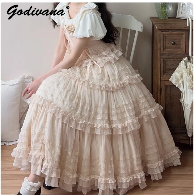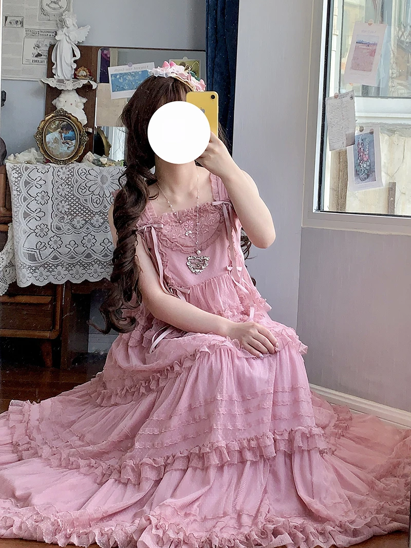 Pink Polka Dot Mesh Lace Multi-layer Long Dress